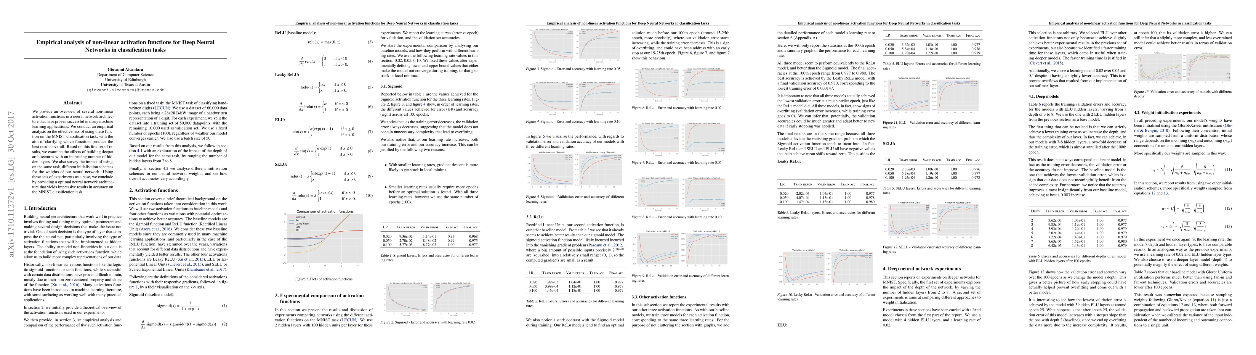 We provide an overview of several non-linear activation functions in a neural network architecture that have proven successful in many machine learning applications. We conduct an empirical analysis on the effectiveness of using these function on the MNIST classification task, with the aim of clarifying which functions produce the best results overall. Based on this first set of results, we examine the effects of building deeper architectures with an increasing number of hidden layers. We also survey the impact of using, on the same task, different initialisation schemes for the weights of our neural network. Using these sets of experiments as a base, we conclude by providing a optimal neural network architecture that yields impressive results in accuracy on the MNIST classification task.
