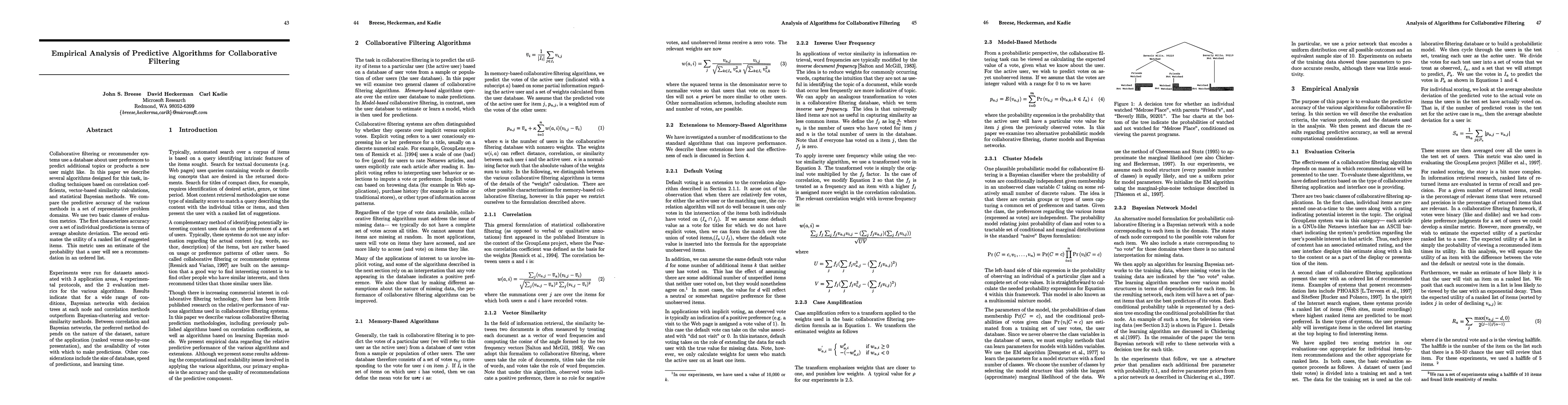 Collaborative filtering or recommender systems use a database about user preferences to predict additional topics or products a new user might like. In this paper we describe several algorithms designed for this task, including techniques based on correlation coefficients, vector-based similarity calculations, and statistical Bayesian methods. We compare the predictive accuracy of the various methods in a set of representative problem domains. We use two basic classes of evaluation metrics. The first characterizes accuracy over a set of individual predictions in terms of average absolute deviation. The second estimates the utility of a ranked list of suggested items. This metric uses an estimate of the probability that a user will see a recommendation in an ordered list. Experiments were run for datasets associated with 3 application areas, 4 experimental protocols, and the 2 evaluation metrics for the various algorithms. Results indicate that for a wide range of conditions, Bayesian networks with decision trees at each node and correlation methods outperform Bayesian-clustering and vector-similarity methods. Between correlation and Bayesian networks, the preferred method depends on the nature of the dataset, nature of the application (ranked versus one-by-one presentation), and the availability of votes with which to make predictions. Other considerations include the size of database, speed of predictions, and learning time.