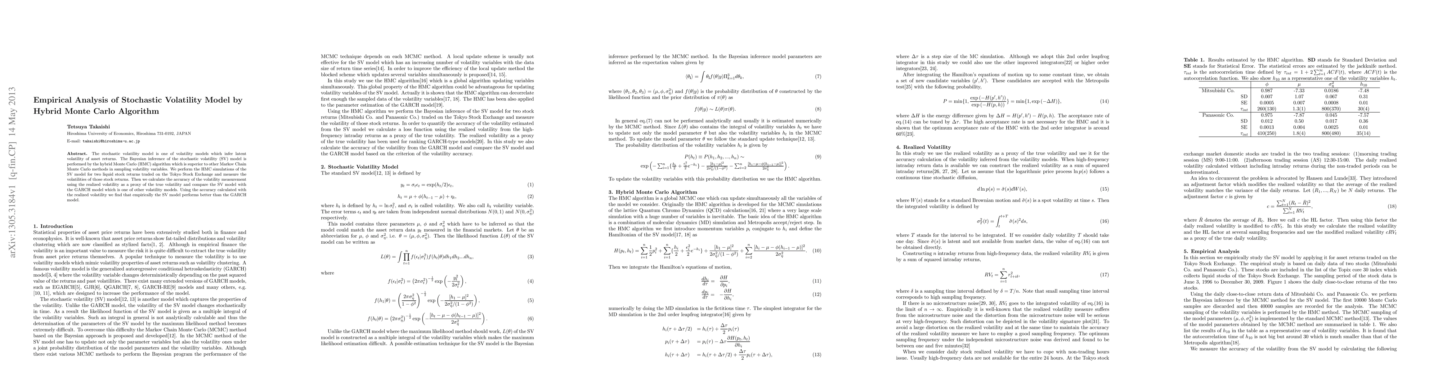 This paper employs the hybrid Monte Carlo (HMC) algorithm to infer latent volatility in a stochastic volatility model, comparing its performance to the GARCH model using realized volatility. Empirical results show that the SV model, estimated via HMC, outperforms the GARCH model in measuring stock return volatilities.