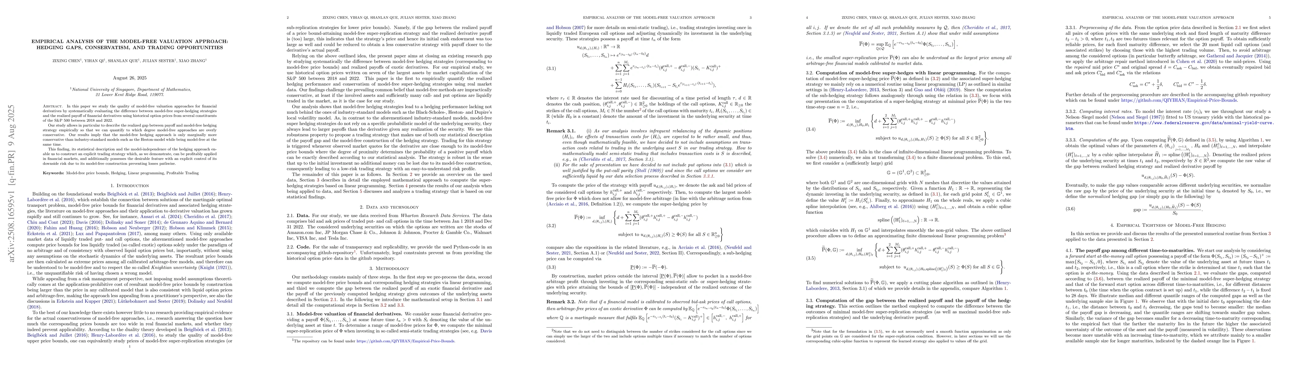 In this paper we study the quality of model-free valuation approaches for financial derivatives by systematically evaluating the difference between model-free super-hedging strategies and the realized payoff of financial derivatives using historical option prices from several constituents of the S&P 500 between 2018 and 2022. Our study allows in particular to describe the realized gap between payoff and model-free hedging strategy empirically so that we can quantify to which degree model-free approaches are overly conservative. Our results imply that the model-free hedging approach is only marginally more conservative than industry-standard models such as the Heston-model while being model-free at the same time. This finding, its statistical description and the model-independence of the hedging approach enable us to construct an explicit trading strategy which, as we demonstrate, can be profitably applied in financial markets, and additionally possesses the desirable feature with an explicit control of its downside risk due to its model-free construction preventing losses pathwise.
