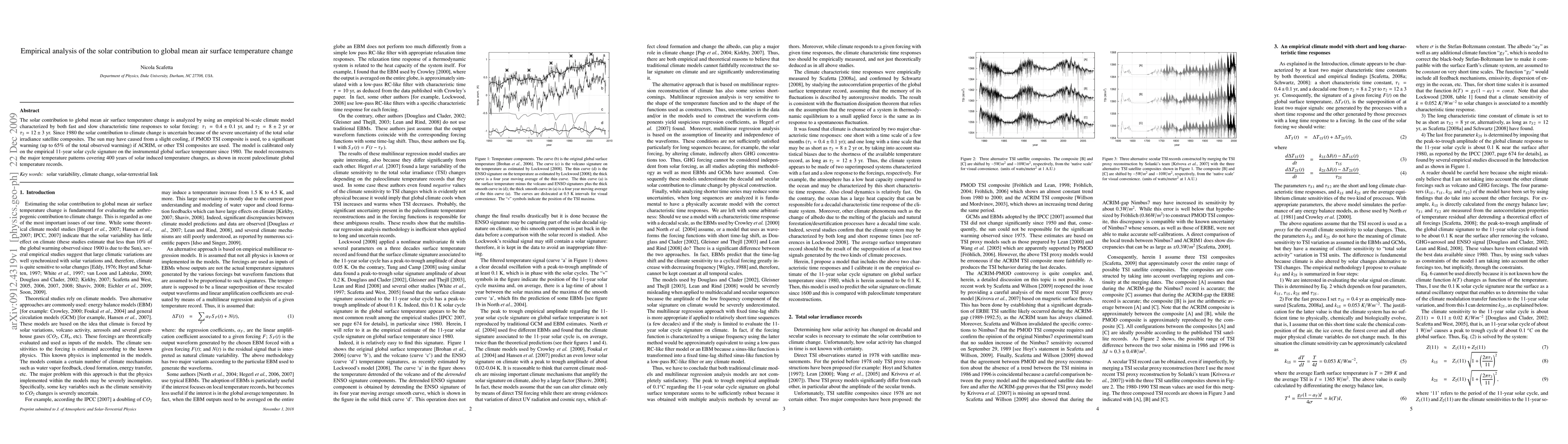 This paper analyzes the solar contribution to global mean air surface temperature changes using an empirical bi-scale climate model. The model suggests a range of solar forcing effects, from slight cooling to significant warming, depending on the total solar irradiance satellite composite used.