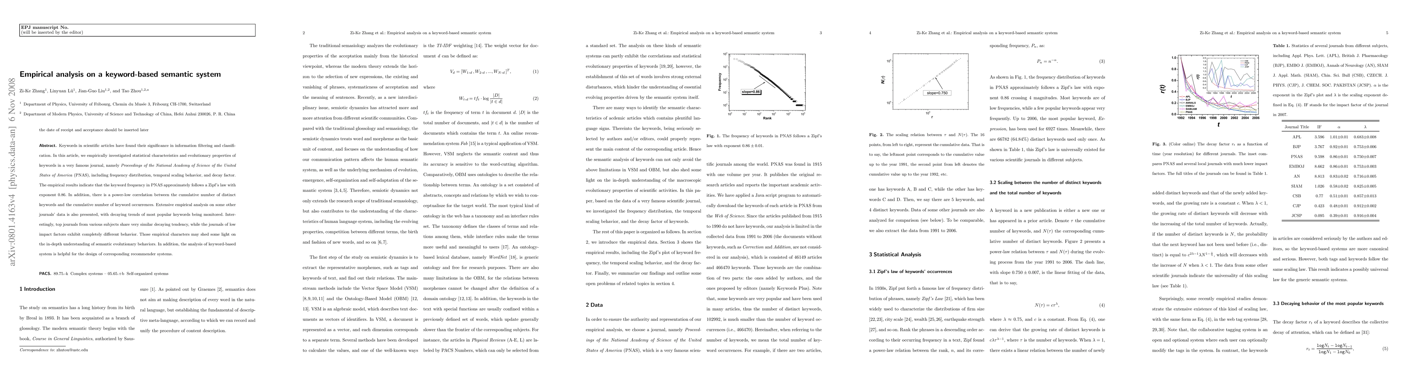 This paper empirically analyzes the statistical characteristics and evolutionary properties of keywords in scientific articles from PNAS, revealing a Zipf's law distribution and power-law correlation between distinct keywords and their occurrences. It also finds that top-tier journals share similar keyword decay trends, contrasting with lower impact journals, providing insights into semantic evolution and aiding in recommender system design.