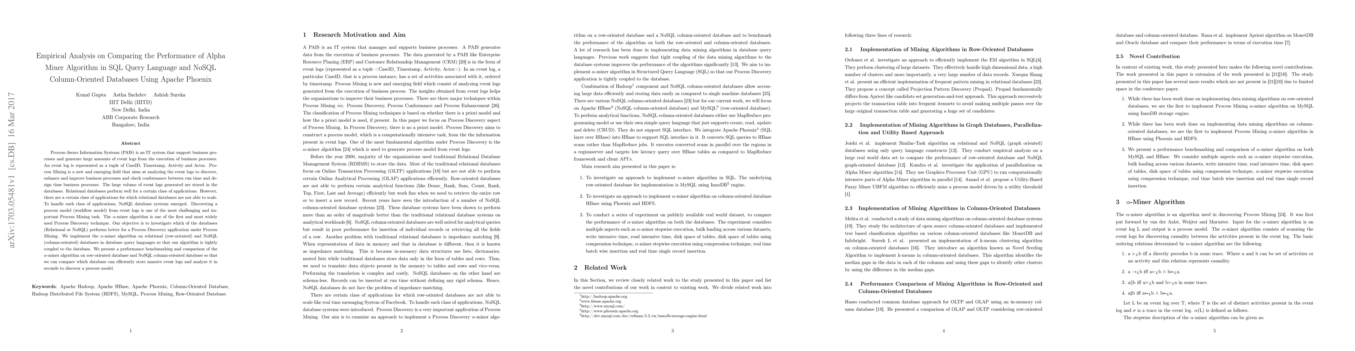 Process-Aware Information Systems (PAIS) is an IT system that support business processes and generate large amounts of event logs from the execution of business processes. An event log is represented as a tuple of CaseID, Timestamp, Activity and Actor. Process Mining is a new and emerging field that aims at analyzing the event logs to discover, enhance and improve business processes and check conformance between run time and design time business processes. The large volume of event logs generated are stored in the databases. Relational databases perform well for a certain class of applications. However, there are a certain class of applications for which relational databases are not able to scale. To handle such class of applications, NoSQL database systems emerged. Discovering a process model (workflow model) from event logs is one of the most challenging and important Process Mining task. The $\alpha$-miner algorithm is one of the first and most widely used Process Discovery technique. Our objective is to investigate which of the databases (Relational or NoSQL) performs better for a Process Discovery application under Process Mining. We implement the $\alpha$-miner algorithm on relational (row-oriented) and NoSQL (column-oriented) databases in database query languages so that our algorithm is tightly coupled to the database. We present a performance benchmarking and comparison of the $\alpha$-miner algorithm on row-oriented database and NoSQL column-oriented database so that we can compare which database can efficiently store massive event logs and analyze it in seconds to discover a process model.