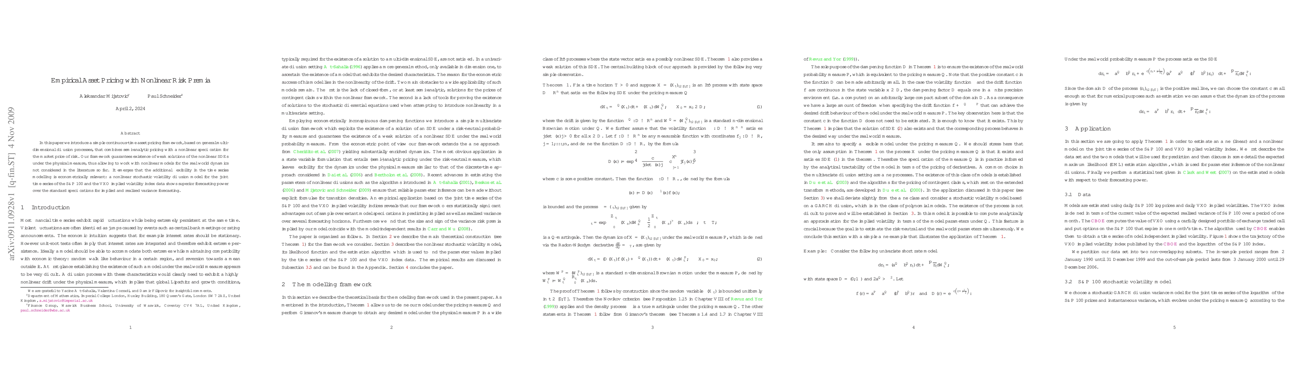 This paper develops a continuous-time asset pricing framework using multi-dimensional diffusion processes with nonlinear risk premia, ensuring the existence of weak solutions. The proposed model demonstrates superior forecasting accuracy for S&P 100 and VXO implied volatility index data compared to standard linear models.