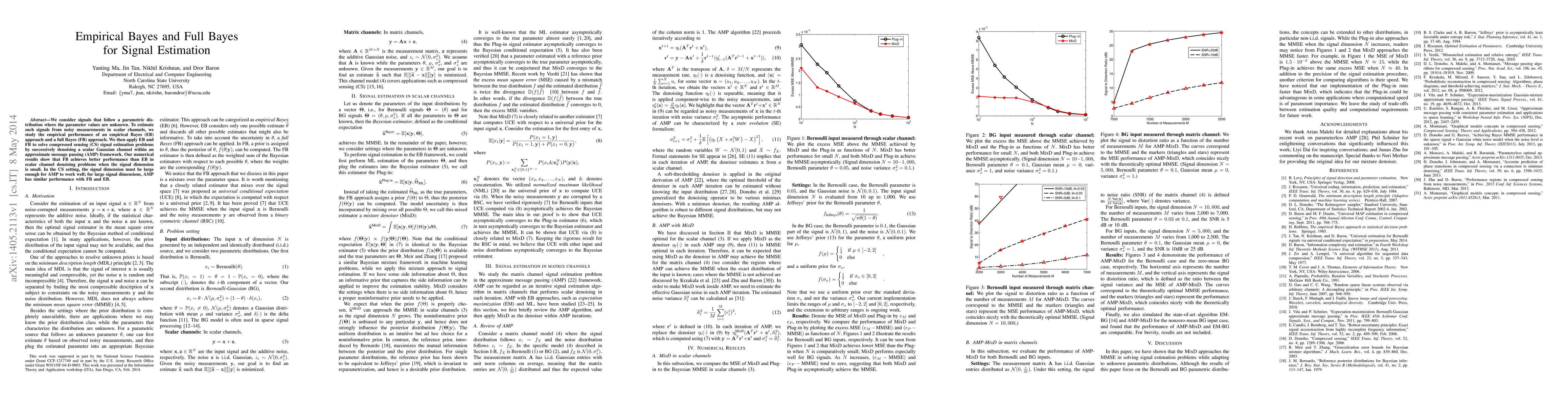This paper compares empirical Bayes (EB) and full Bayes (FB) approaches for signal estimation in parametric distributions, finding that FB outperforms EB in small-dimensional scalar channel denoising but AMP achieves similar results as FB and EB for large signal dimensions in compressed sensing settings.