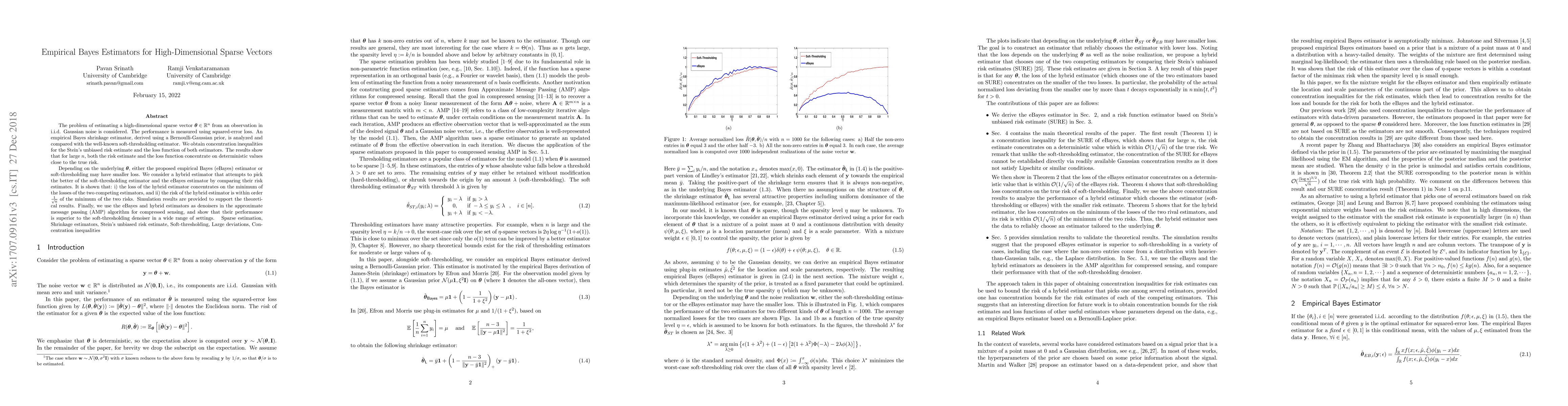 This paper proposes an empirical Bayes shrinkage estimator for high-dimensional sparse vector estimation under Gaussian noise, comparing it with the soft-thresholding estimator. The hybrid estimator, which selects the better of the two based on risk estimates, shows superior performance in terms of loss concentration and risk minimization, supported by simulation results and applications in compressed sensing.