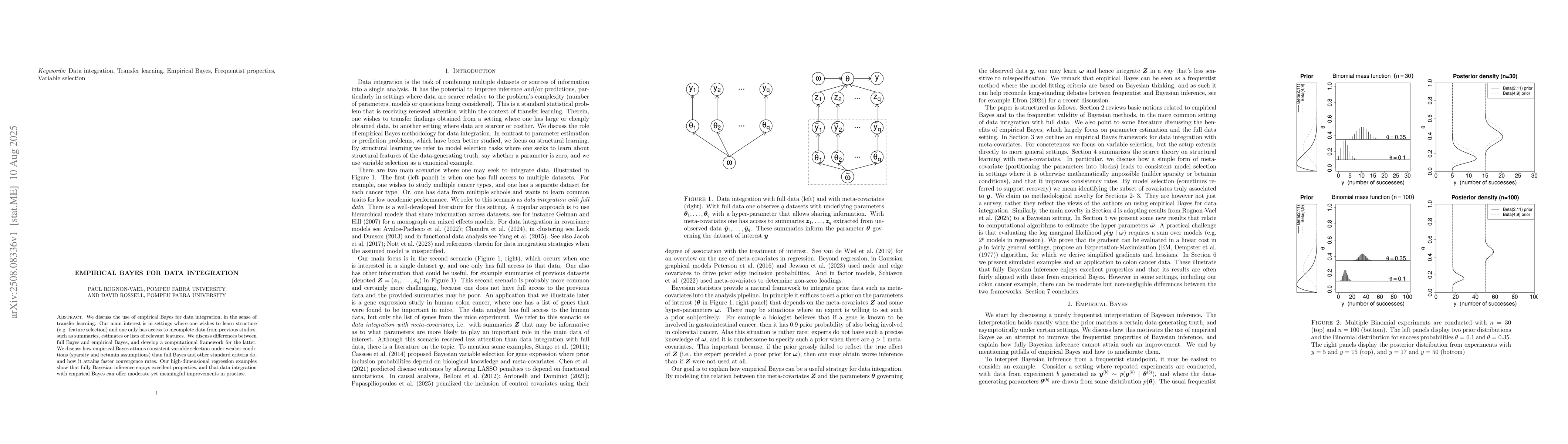 We discuss the use of empirical Bayes for data integration, in the sense of transfer learning. Our main interest is in settings where one wishes to learn structure (e.g. feature selection) and one only has access to incomplete data from previous studies, such as summaries, estimates or lists of relevant features. We discuss differences between full Bayes and empirical Bayes, and develop a computational framework for the latter. We discuss how empirical Bayes attains consistent variable selection under weaker conditions (sparsity and betamin assumptions) than full Bayes and other standard criteria do, and how it attains faster convergence rates. Our high-dimensional regression examples show that fully Bayesian inference enjoys excellent properties, and that data integration with empirical Bayes can offer moderate yet meaningful improvements in practice.