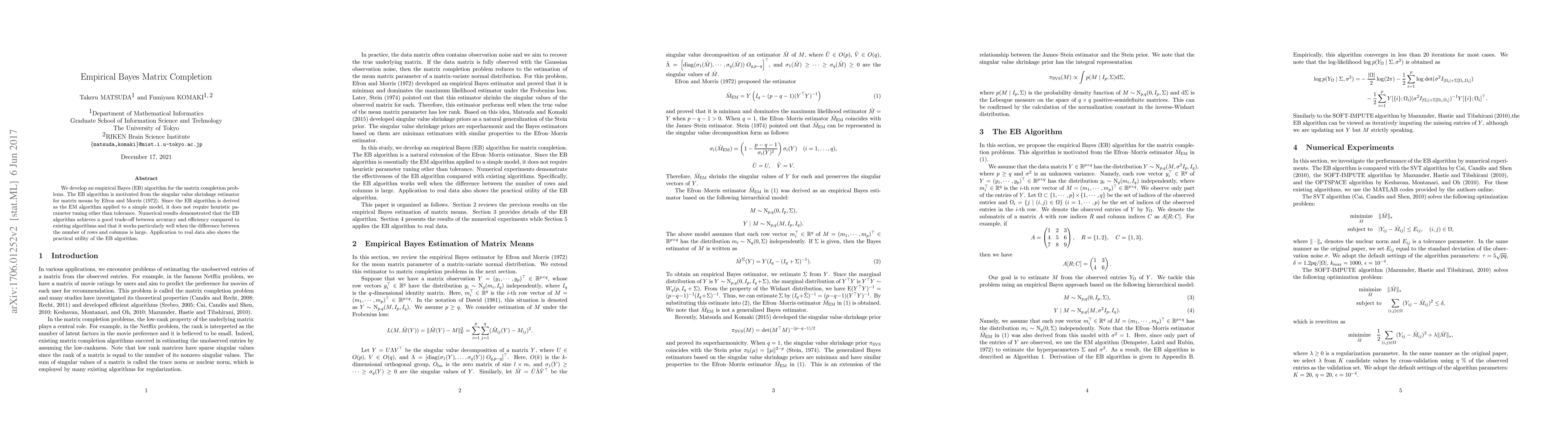 The paper proposes an empirical Bayes algorithm for matrix completion, leveraging singular value shrinkage, which achieves a good balance between accuracy and efficiency, especially when matrix dimensions differ significantly. The method requires minimal parameter tuning and demonstrates practical utility through real data applications.
