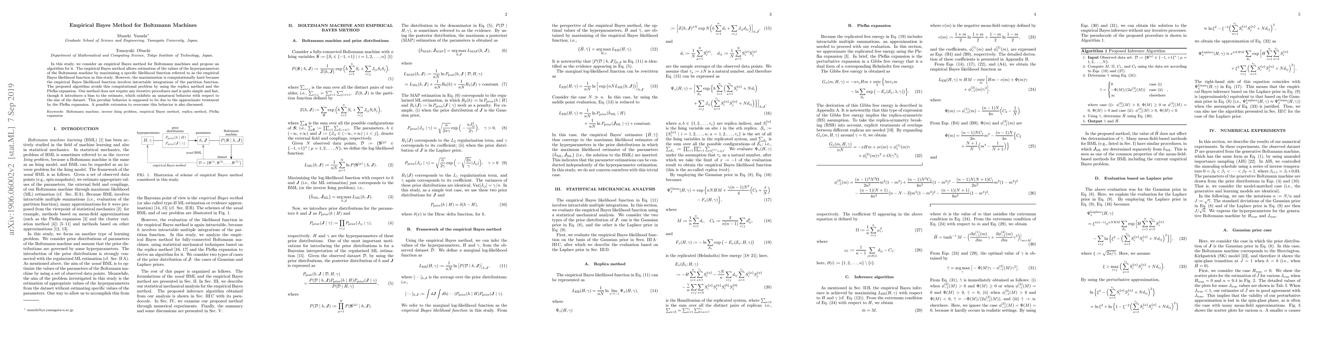 This paper proposes an empirical Bayes method for estimating hyperparameters in Boltzmann machines using a non-iterative algorithm based on the replica method and Plefka expansion. While the method is simple and fast, it introduces bias and unnatural behavior in estimates relative to dataset size, likely due to the Plefka expansion approximation.