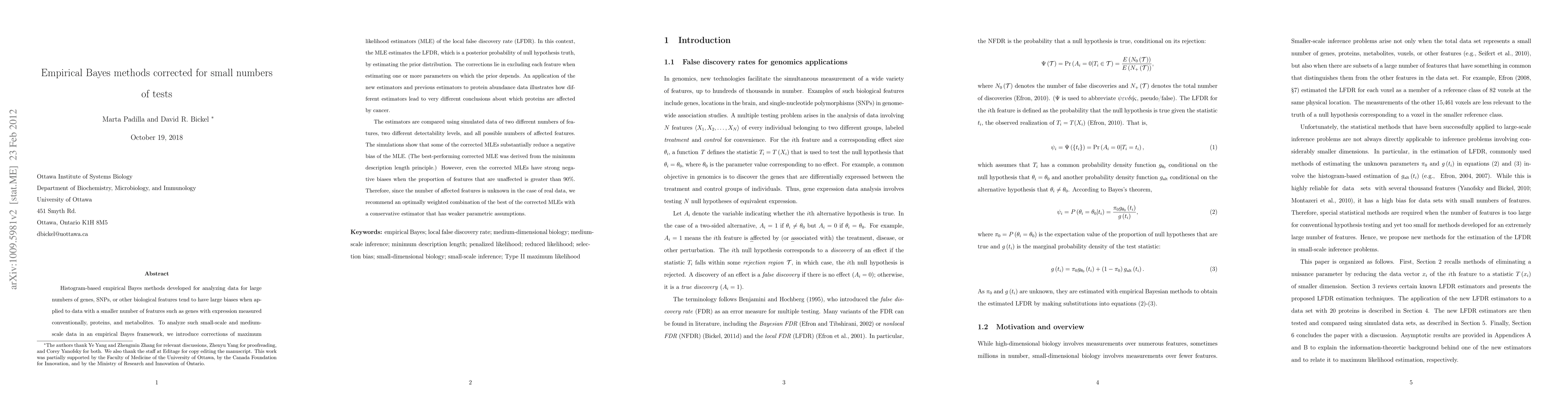Histogram-based empirical Bayes methods developed for analyzing data for large numbers of genes, SNPs, or other biological features tend to have large biases when applied to data with a smaller number of features such as genes with expression measured conventionally, proteins, and metabolites. To analyze such small-scale and medium-scale data in an empirical Bayes framework, we introduce corrections of maximum likelihood estimators (MLE) of the local false discovery rate (LFDR). In this context, the MLE estimates the LFDR, which is a posterior probability of null hypothesis truth, by estimating the prior distribution. The corrections lie in excluding each feature when estimating one or more parameters on which the prior depends. An application of the new estimators and previous estimators to protein abundance data illustrates how different estimators lead to very different conclusions about which proteins are affected by cancer. The estimators are compared using simulated data of two different numbers of features, two different detectability levels, and all possible numbers of affected features. The simulations show that some of the corrected MLEs substantially reduce a negative bias of the MLE. (The best-performing corrected MLE was derived from the minimum description length principle.) However, even the corrected MLEs have strong negative biases when the proportion of features that are unaffected is greater than 90%. Therefore, since the number of affected features is unknown in the case of real data, we recommend an optimally weighted combination of the best of the corrected MLEs with a conservative estimator that has weaker parametric assumptions.