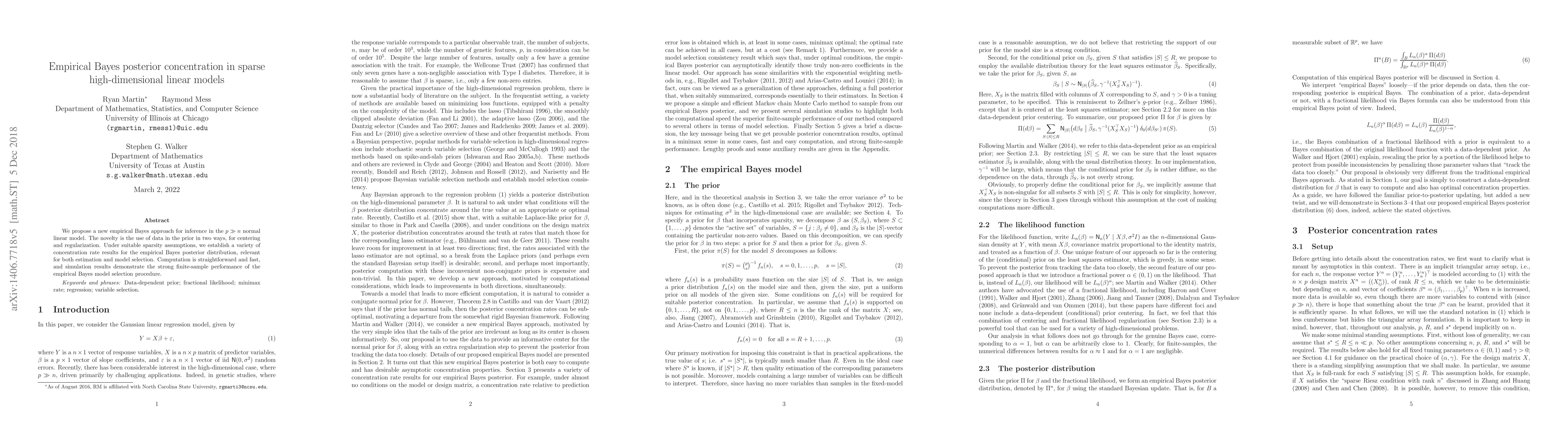 This paper introduces a novel empirical Bayes method for inference in high-dimensional linear models where the number of variables exceeds the number of observations. It leverages data for both centering and regularization, establishing concentration rate results for the empirical Bayes posterior under sparsity assumptions, and demonstrating strong performance in simulations.