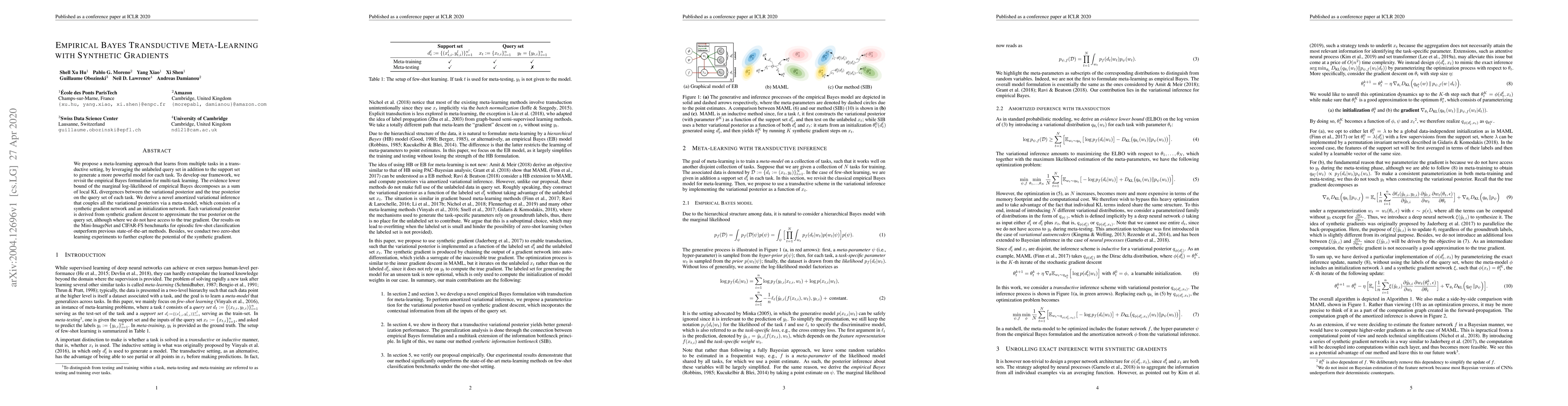This paper introduces a transductive meta-learning method using empirical Bayes and synthetic gradients to improve model performance on few-shot classification tasks. The approach leverages unlabeled query data and an amortized variational inference framework to approximate posteriors, outperforming previous methods on Mini-ImageNet and CIFAR-FS benchmarks.