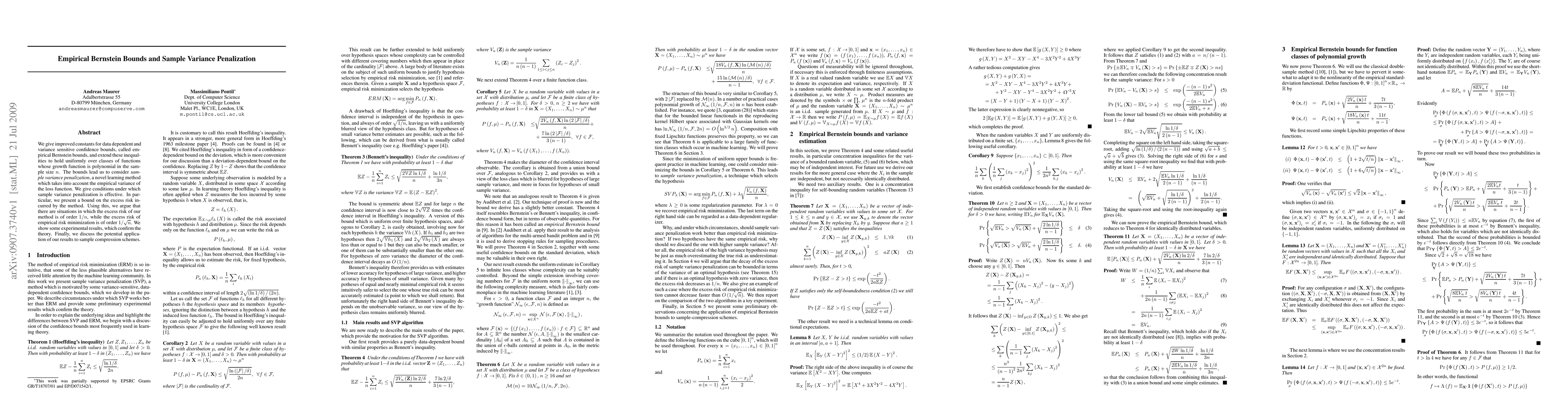 We give improved constants for data dependent and variance sensitive confidence bounds, called empirical Bernstein bounds, and extend these inequalities to hold uniformly over classes of functionswhose growth function is polynomial in the sample size n. The bounds lead us to consider sample variance penalization, a novel learning method which takes into account the empirical variance of the loss function. We give conditions under which sample variance penalization is effective. In particular, we present a bound on the excess risk incurred by the method. Using this, we argue that there are situations in which the excess risk of our method is of order 1/n, while the excess risk of empirical risk minimization is of order 1/sqrt/{n}. We show some experimental results, which confirm the theory. Finally, we discuss the potential application of our results to sample compression schemes.
