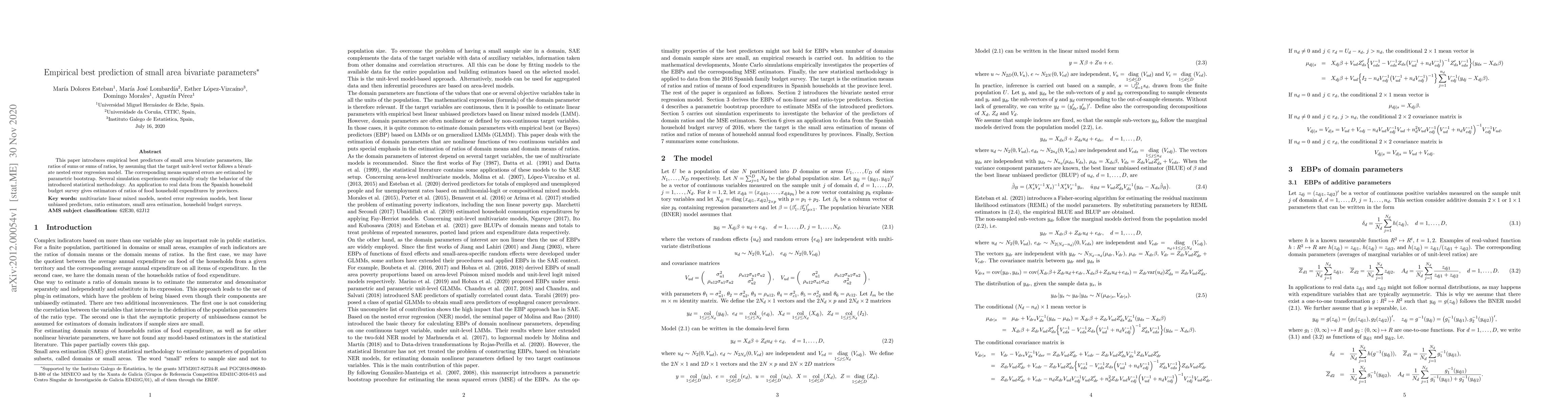 This paper develops empirical best predictors for small area bivariate parameters under a bivariate nested error regression model, estimating mean squared errors via parametric bootstrap. Simulation studies and an application to Spanish household budget survey data demonstrate the methodology's effectiveness in estimating ratios of food expenditures by province.