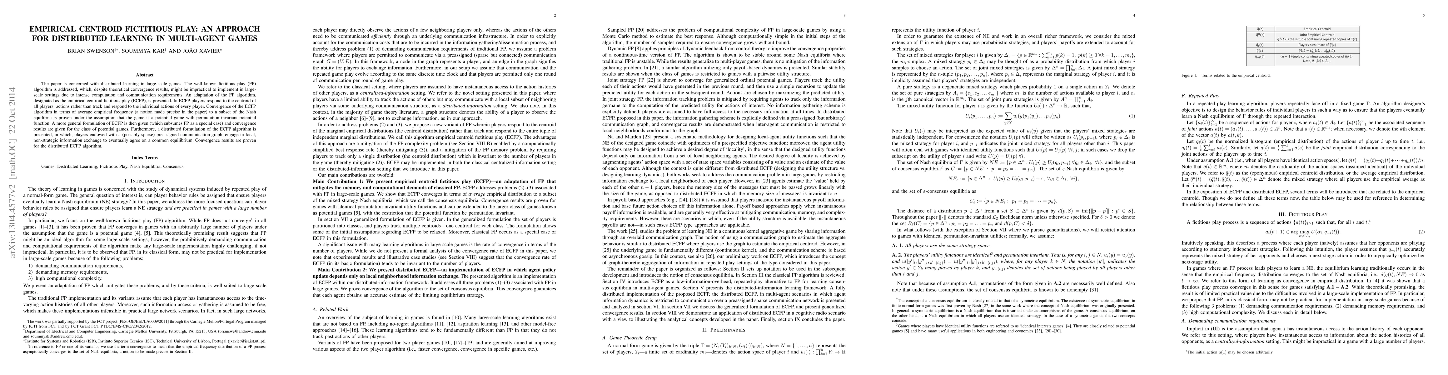 The paper proposes an empirical centroid fictitious play (ECFP) algorithm for distributed learning in large-scale multi-agent games, addressing the impracticality of traditional fictitious play due to high computational and communication costs. The ECFP algorithm converges to a subset of Nash equilibria in potential games and is extended to a distributed version with convergence guarantees.