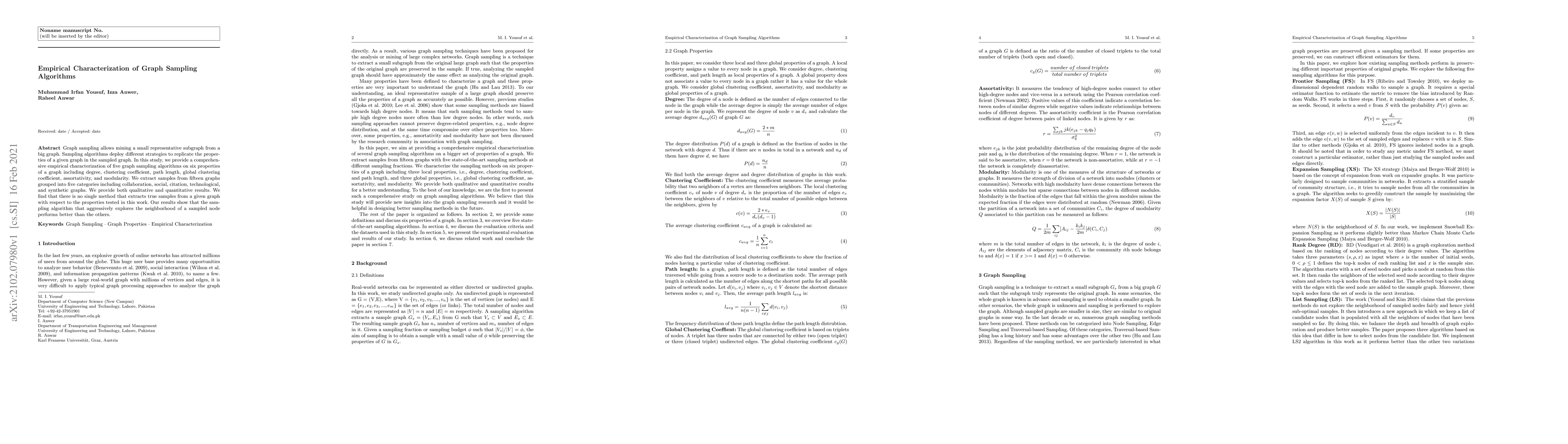 Graph sampling allows mining a small representative subgraph from a big graph. Sampling algorithms deploy different strategies to replicate the properties of a given graph in the sampled graph. In this study, we provide a comprehensive empirical characterization of five graph sampling algorithms on six properties of a graph including degree, clustering coefficient, path length, global clustering coefficient, assortativity, and modularity. We extract samples from fifteen graphs grouped into five categories including collaboration, social, citation, technological, and synthetic graphs. We provide both qualitative and quantitative results. We find that there is no single method that extracts true samples from a given graph with respect to the properties tested in this work. Our results show that the sampling algorithm that aggressively explores the neighborhood of a sampled node performs better than the others.