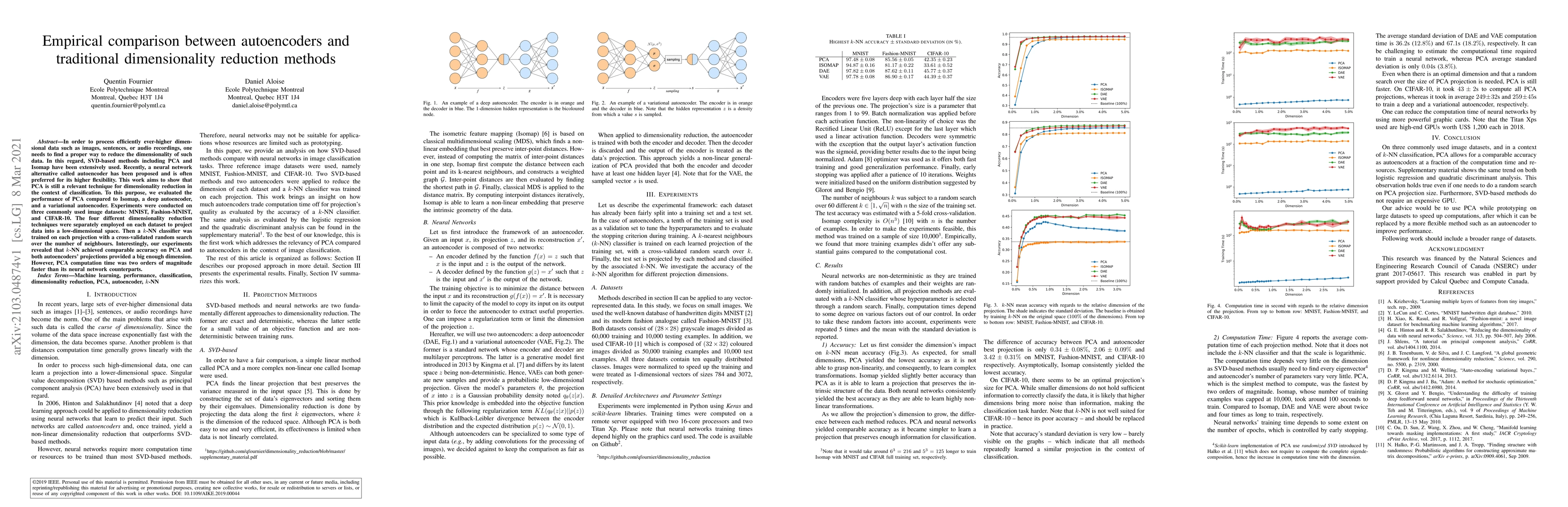 In order to process efficiently ever-higher dimensional data such as images, sentences, or audio recordings, one needs to find a proper way to reduce the dimensionality of such data. In this regard, SVD-based methods including PCA and Isomap have been extensively used. Recently, a neural network alternative called autoencoder has been proposed and is often preferred for its higher flexibility. This work aims to show that PCA is still a relevant technique for dimensionality reduction in the context of classification. To this purpose, we evaluated the performance of PCA compared to Isomap, a deep autoencoder, and a variational autoencoder. Experiments were conducted on three commonly used image datasets: MNIST, Fashion-MNIST, and CIFAR-10. The four different dimensionality reduction techniques were separately employed on each dataset to project data into a low-dimensional space. Then a k-NN classifier was trained on each projection with a cross-validated random search over the number of neighbours. Interestingly, our experiments revealed that k-NN achieved comparable accuracy on PCA and both autoencoders' projections provided a big enough dimension. However, PCA computation time was two orders of magnitude faster than its neural network counterparts.