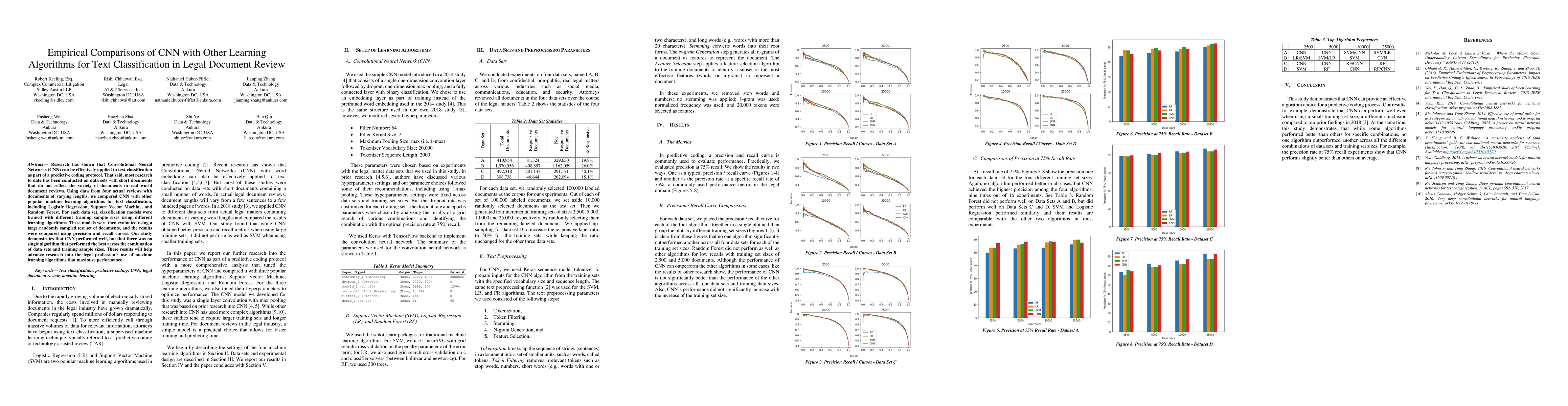 This study compares Convolutional Neural Networks (CNN) with Logistic Regression, Support Vector Machine, and Random Forest for text classification in legal document reviews using real-world data. While CNN performed well, no single algorithm consistently outperformed others across different datasets and training sizes, highlighting the need for tailored approaches in legal document review.
