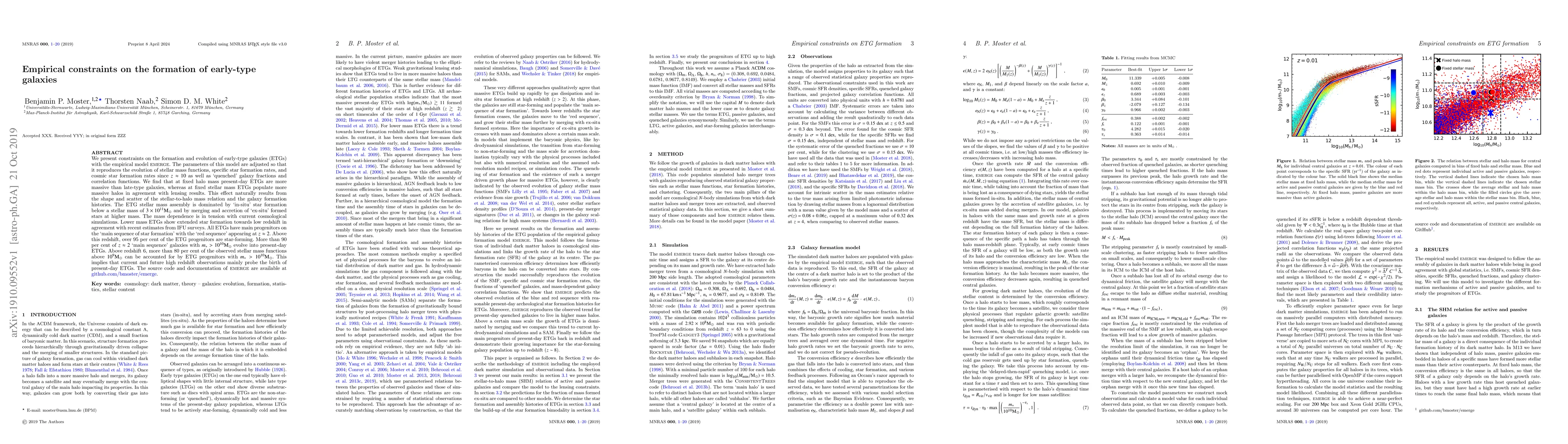 We present constraints on the formation and evolution of early-type galaxies (ETGs) with the empirical model EMERGE. The parameters of this model are adjusted so that it reproduces the evolution of stellar mass functions, specific star formation rates, and cosmic star formation rates since $z\approx10$ as well as 'quenched' galaxy fractions and correlation functions. We find that at fixed halo mass present-day ETGs are more massive than late-type galaxies, whereas at fixed stellar mass ETGs populate more massive halos in agreement with lensing results. This effect naturally results from the shape and scatter of the stellar-to-halo mass relation and the galaxy formation histories. The ETG stellar mass assembly is dominated by 'in-situ' star formation below a stellar mass of $3\times10^{11}\mathrm{M}_\odot$ and by merging and accretion of 'ex-situ' formed stars at higher mass. The mass dependence is in tension with current cosmological simulations. Lower mass ETGs show extended star formation towards low redshift in agreement with recent estimates from IFU surveys. All ETGs have main progenitors on the 'main sequence of star formation' with the 'red sequence' appearing at $z \approx 2$. Above this redshift, over 95 per cent of the ETG progenitors are star-forming. More than 90 per cent of $z \approx 2$ 'main sequence' galaxies with $m_* > 10^{10}\mathrm{M}_\odot$ evolve into present-day ETGs. Above redshift 6, more than 80 per cent of the observed stellar mass functions above $10^{9}\mathrm{M}_\odot$ can be accounted for by ETG progenitors with $m_* > 10^{10}\mathrm{M}_\odot$. This implies that current and future high redshift observations mainly probe the birth of present-day ETGs. The source code and documentation of EMERGE are available at github.com/bmoster/emerge.