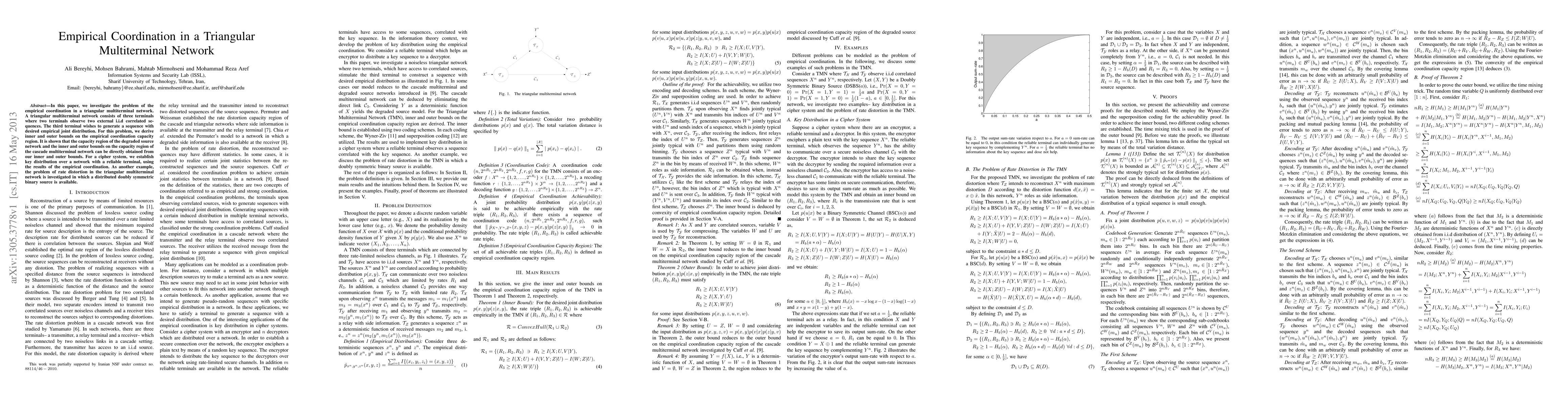 The paper investigates empirical coordination in a triangular multiterminal network, deriving inner and outer bounds on the empirical coordination capacity region. It utilizes coding schemes including Wyner-Ziv and superposition coding for achievability, and applies the time-mixing trick for the outer bound proof.