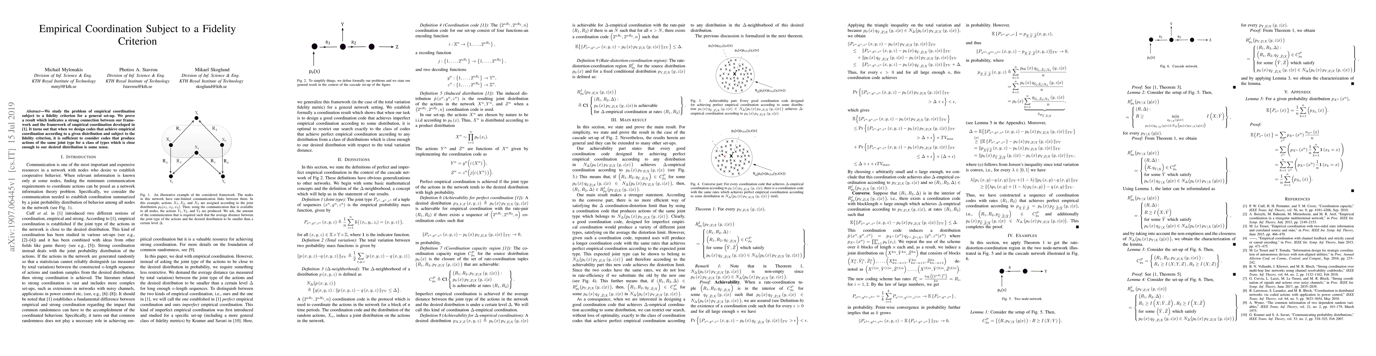 The research employs a mathematical framework to study empirical coordination subject to a fidelity criterion, proving a result that connects their setup with a previously developed framework in [1].