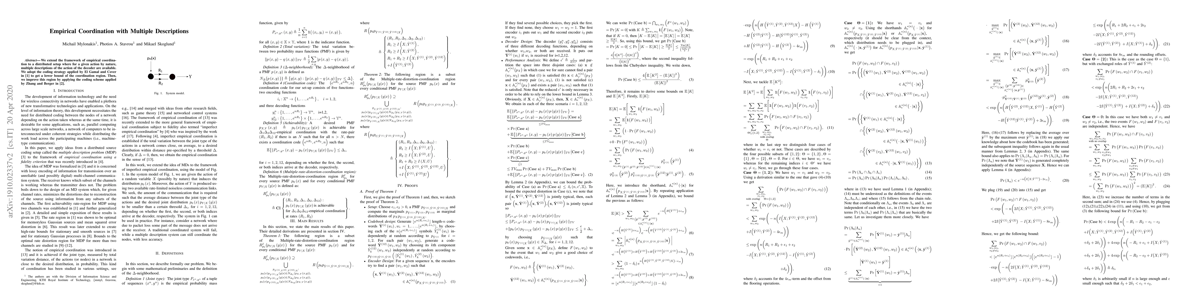 This paper extends empirical coordination to a distributed setting with multiple decoder descriptions, using El Gamal and Cover's coding strategy to establish a coordination region lower bound, and then enhances it with Zhang and Berger's coding scheme.