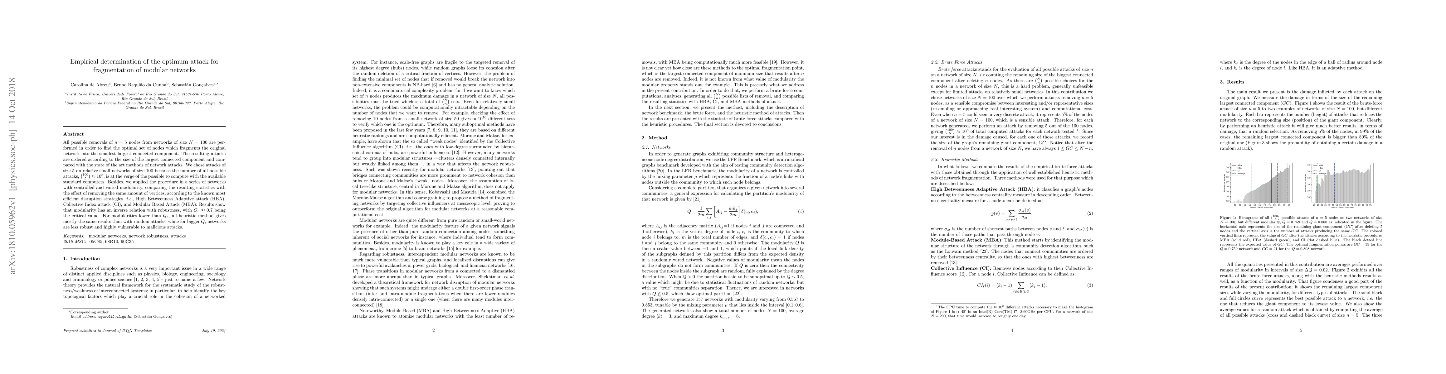 This study empirically determines the optimal set of 5 nodes to remove from modular networks of size 100 to fragment the network into the smallest largest connected component, comparing results with state-of-the-art attack methods. Findings reveal that modularity inversely correlates with robustness, with a critical modularity value of approximately 0.7.