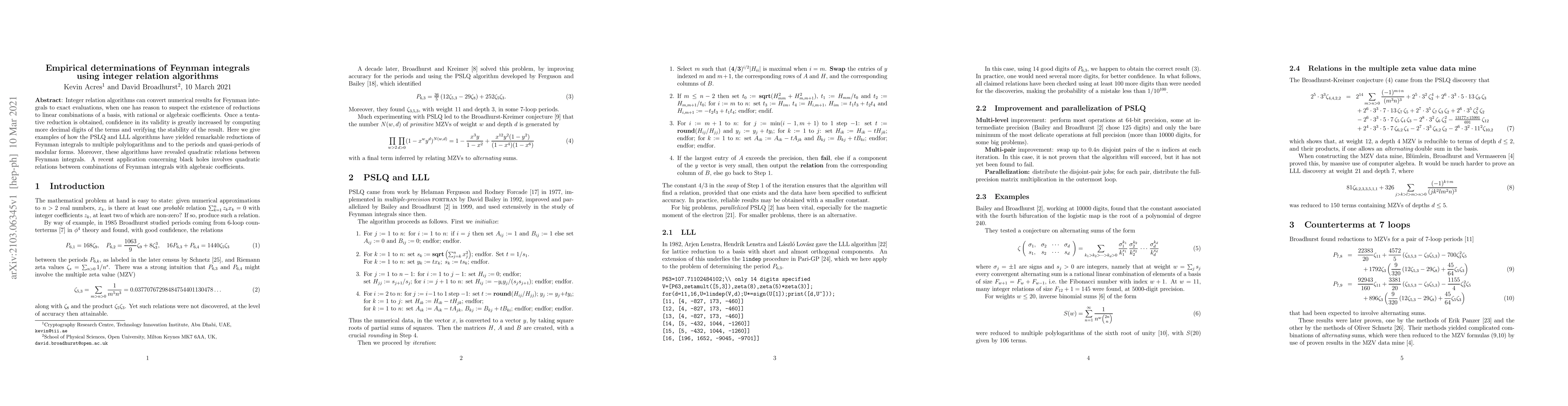 This paper demonstrates how integer relation algorithms like PSLQ and LLL convert numerical results of Feynman integrals into exact evaluations by identifying reductions to linear combinations with rational or algebraic coefficients. It highlights successful applications in reducing Feynman integrals to multiple polylogarithms and modular forms, and reveals quadratic relations between Feynman integrals in the context of black holes.
