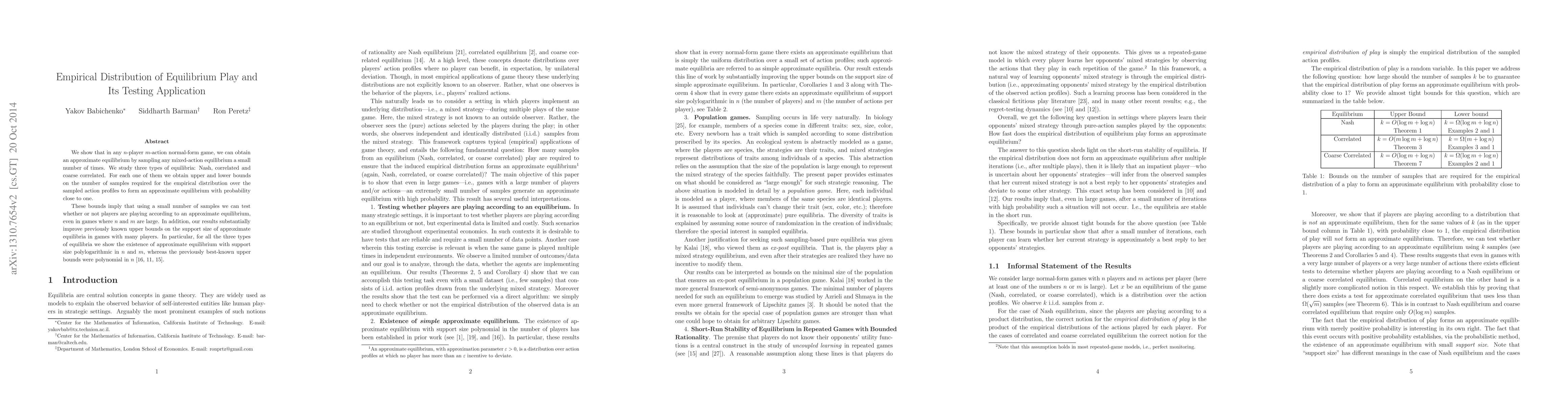 We show that in any $n$-player $m$-action normal-form game, we can obtain an approximate equilibrium by sampling any mixed-action equilibrium a small number of times. We study three types of equilibria: Nash, correlated and coarse correlated. For each one of them we obtain upper and lower bounds on the number of samples required for the empirical distribution over the sampled action profiles to form an approximate equilibrium with probability close to one. These bounds imply that using a small number of samples we can test whether or not players are playing according to an approximate equilibrium, even in games where $n$ and $m$ are large. In addition, our results substantially improve previously known upper bounds on the support size of approximate equilibria in games with many players. In particular, for all the three types of equilibria we show the existence of approximate equilibrium with support size polylogarithmic in $n$ and $m$, whereas the previously best-known upper bounds were polynomial in $n$.