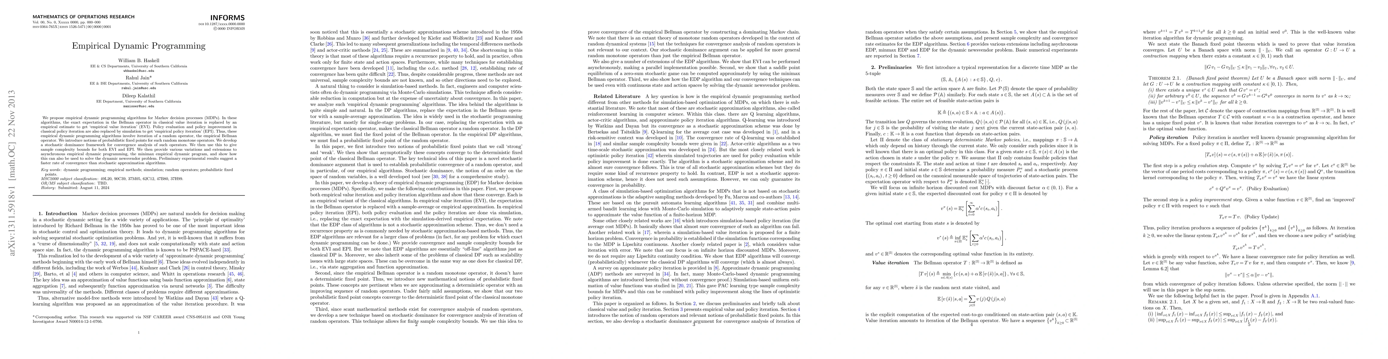 This paper proposes empirical dynamic programming algorithms for Markov decision processes, replacing exact expectations with empirical estimates to develop empirical value and policy iteration. It introduces probabilistic fixed points and stochastic dominance for convergence analysis, providing sample complexity bounds and exploring variations like asynchronous methods and the minimax empirical dynamic program.