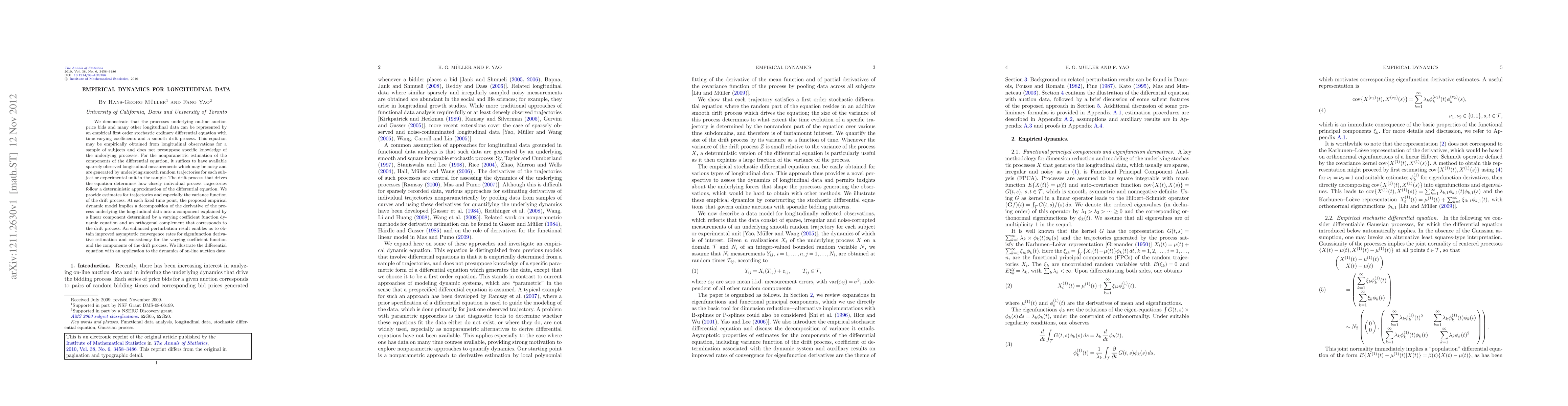 We demonstrate that the processes underlying on-line auction price bids and many other longitudinal data can be represented by an empirical first order stochastic ordinary differential equation with time-varying coefficients and a smooth drift process. This equation may be empirically obtained from longitudinal observations for a sample of subjects and does not presuppose specific knowledge of the underlying processes. For the nonparametric estimation of the components of the differential equation, it suffices to have available sparsely observed longitudinal measurements which may be noisy and are generated by underlying smooth random trajectories for each subject or experimental unit in the sample. The drift process that drives the equation determines how closely individual process trajectories follow a deterministic approximation of the differential equation. We provide estimates for trajectories and especially the variance function of the drift process. At each fixed time point, the proposed empirical dynamic model implies a decomposition of the derivative of the process underlying the longitudinal data into a component explained by a linear component determined by a varying coefficient function dynamic equation and an orthogonal complement that corresponds to the drift process. An enhanced perturbation result enables us to obtain improved asymptotic convergence rates for eigenfunction derivative estimation and consistency for the varying coefficient function and the components of the drift process. We illustrate the differential equation with an application to the dynamics of on-line auction data.