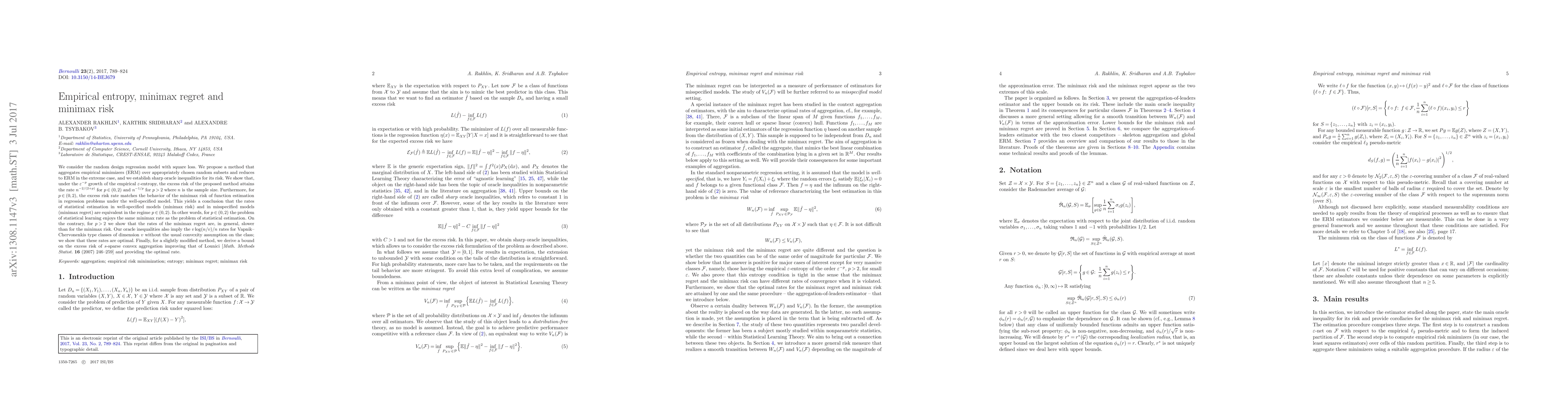 We consider the random design regression model with square loss. We propose a method that aggregates empirical minimizers (ERM) over appropriately chosen random subsets and reduces to ERM in the extreme case, and we establish sharp oracle inequalities for its risk. We show that, under the $\varepsilon^{-p}$ growth of the empirical $\varepsilon$-entropy, the excess risk of the proposed method attains the rate $n^{-2/(2+p)}$ for $p\in(0,2)$ and $n^{-1/p}$ for $p>2$ where $n$ is the sample size. Furthermore, for $p\in(0,2)$, the excess risk rate matches the behavior of the minimax risk of function estimation in regression problems under the well-specified model. This yields a conclusion that the rates of statistical estimation in well-specified models (minimax risk) and in misspecified models (minimax regret) are equivalent in the regime $p\in(0,2)$. In other words, for $p\in(0,2)$ the problem of statistical learning enjoys the same minimax rate as the problem of statistical estimation. On the contrary, for $p>2$ we show that the rates of the minimax regret are, in general, slower than for the minimax risk. Our oracle inequalities also imply the $v\log(n/v)/n$ rates for Vapnik-Chervonenkis type classes of dimension $v$ without the usual convexity assumption on the class; we show that these rates are optimal. Finally, for a slightly modified method, we derive a bound on the excess risk of $s$-sparse convex aggregation improving that of Lounici [Math. Methods Statist. 16 (2007) 246-259] and providing the optimal rate.