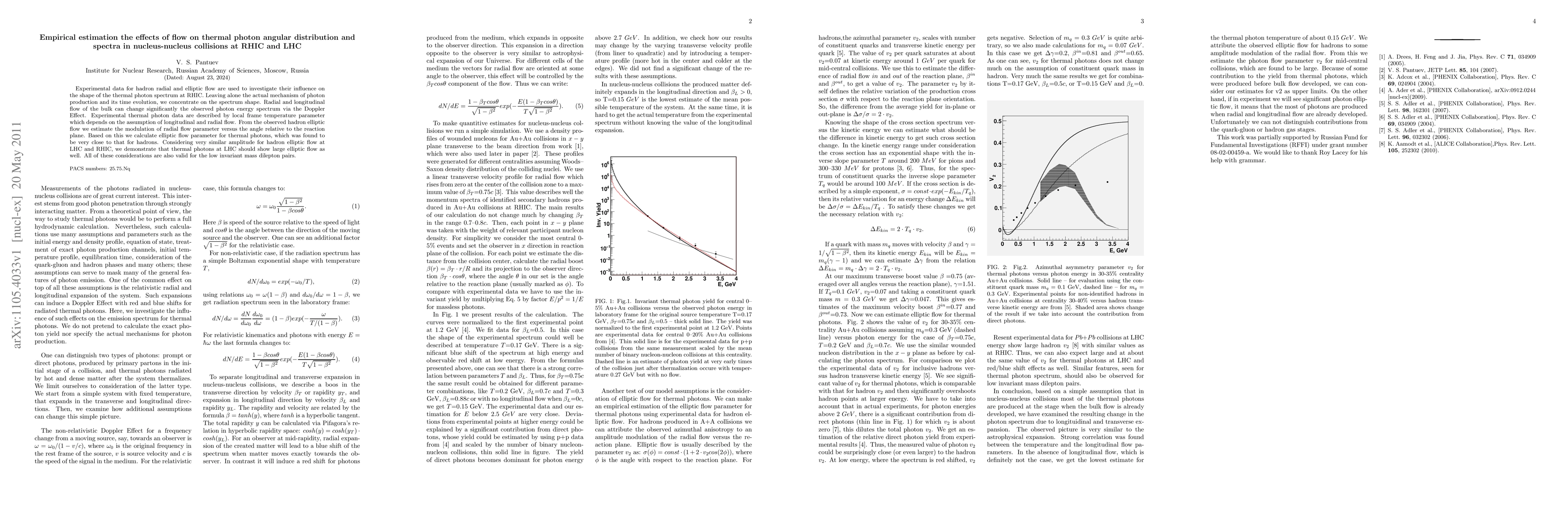 Experimental data for hadron radial and elliptic flow are used to investigate their influence on the shape of the thermal photon spectrum at RHIC. Leaving alone the actual mechanism of photon production and its time evolution, we concentrate on the spectrum shape. Radial and longitudinal flow of the bulk can change significantly the observed photon energy spectrum via the Doppler Effect. Experimental thermal photon data are described by local frame temperature parameter which depends on the assumption of longitudinal and radial flow. From the observed hadron elliptic flow we estimate the modulation of radial flow parameter versus the angle relative to the reaction plane. Based on this we calculate elliptic flow parameter for thermal photons, which was found to be very close to that for hadrons. Considering very similar amplitude for hadron elliptic flow at LHC and RHIC, we demonstrate that thermal photons at LHC should show large elliptic flow as well. All of these considerations are also valid for the low invariant mass dilepton pairs.