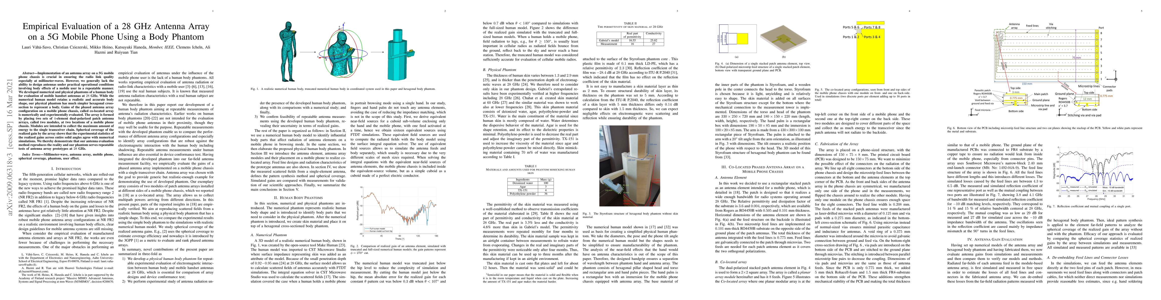 This paper evaluates a 28 GHz phased antenna array on a 5G mobile phone using both numerical and physical body phantoms. The study demonstrates that the antenna array achieves spherical coverage and that experimental results align with numerical simulations, validating the method for repeatable antenna prototype testing.