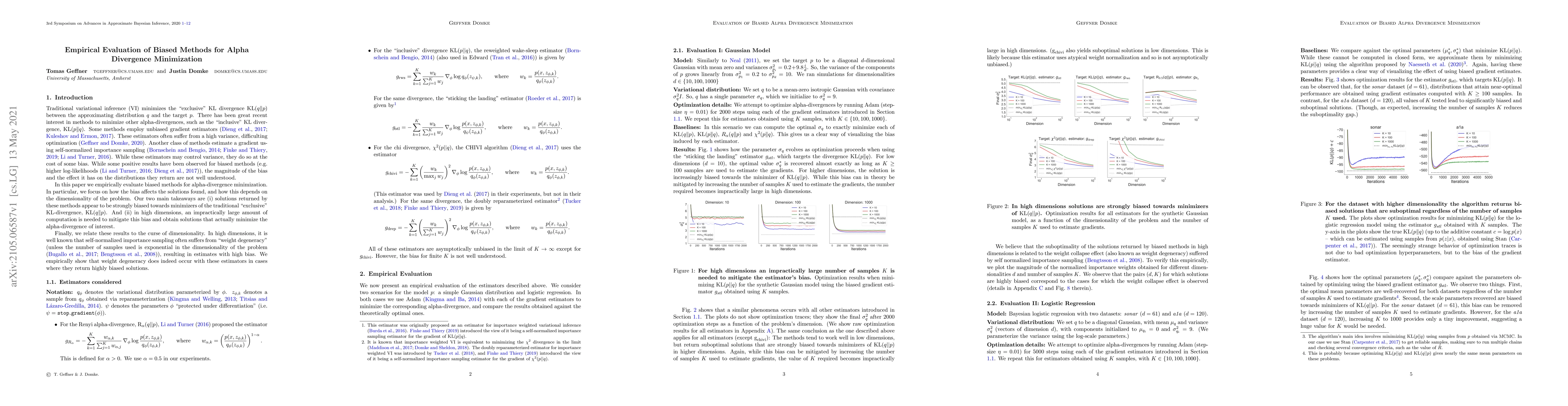In this paper we empirically evaluate biased methods for alpha-divergence minimization. In particular, we focus on how the bias affects the final solutions found, and how this depends on the dimensionality of the problem. We find that (i) solutions returned by these methods appear to be strongly biased towards minimizers of the traditional "exclusive" KL-divergence, KL(q||p), and (ii) in high dimensions, an impractically large amount of computation is needed to mitigate this bias and obtain solutions that actually minimize the alpha-divergence of interest.