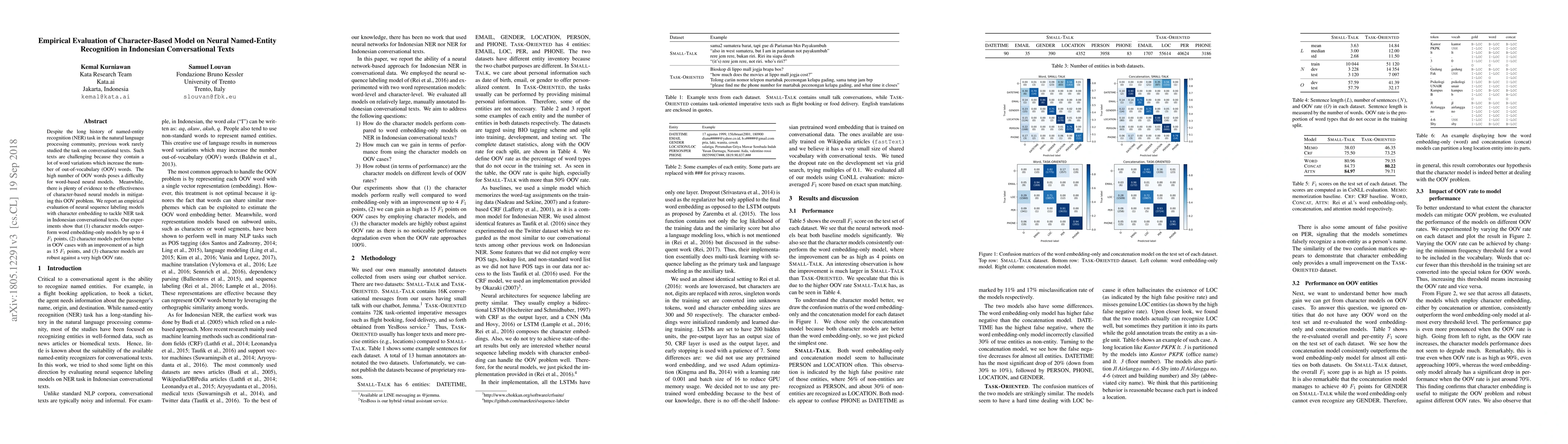 This paper evaluates character-based neural models for named-entity recognition (NER) in Indonesian conversational texts, demonstrating that character models outperform word-based models by up to 4 $F_1$ points and significantly better handle out-of-vocabulary words, improving by up to 15 $F_1$ points.