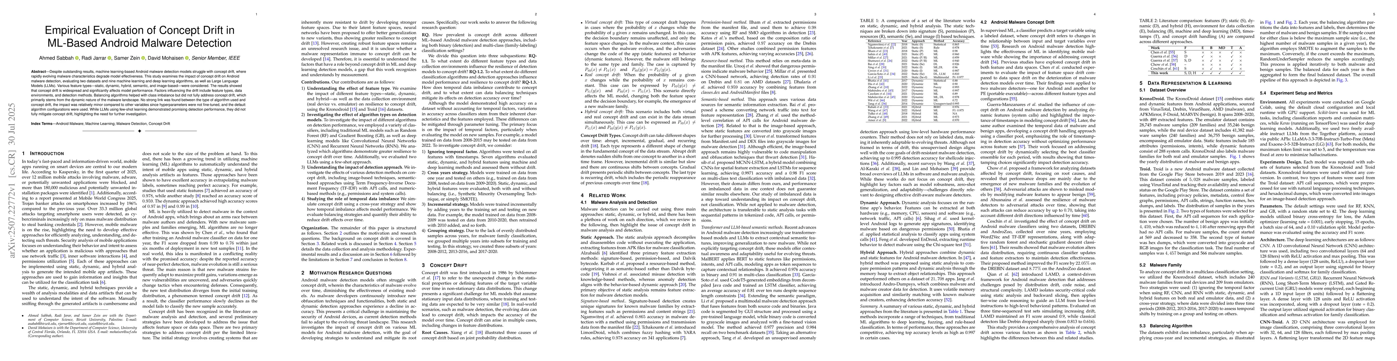 This study evaluates the impact of concept drift on Android malware detection using two datasets (KronoDroid and Troid) and nine machine learning and deep learning algorithms, including Large Language Models (LLMs). It examines various feature types—static, dynamic, hybrid, semantic, and image-based—to understand how concept drift affects model performance.