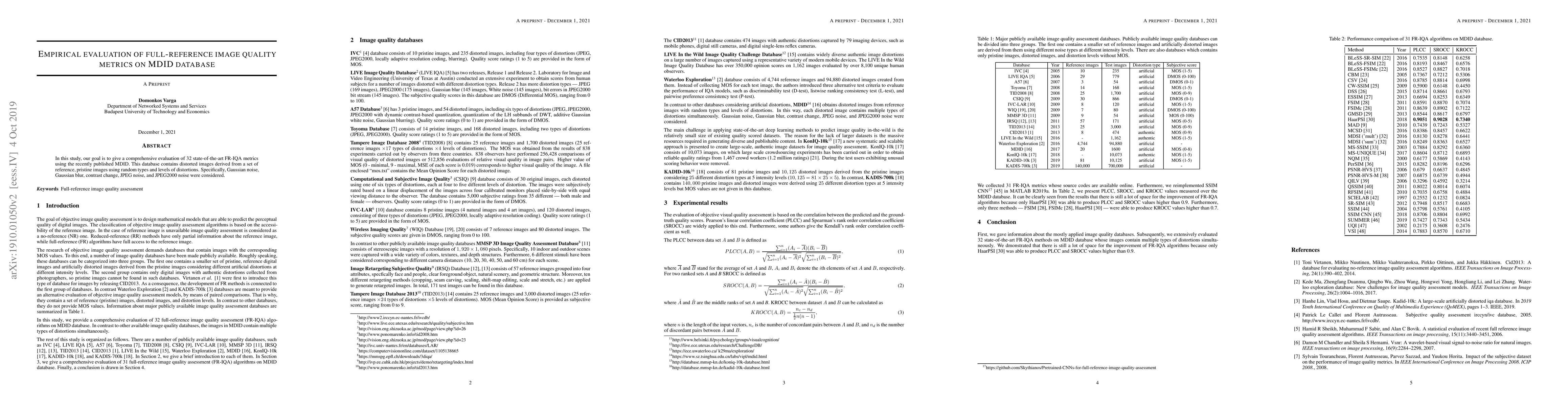 In this study, our goal is to give a comprehensive evaluation of 32 state-of-the-art FR-IQA metrics using the recently published MDID. This database contains distorted images derived from a set of reference, pristine images using random types and levels of distortions. Specifically, Gaussian noise, Gaussian blur, contrast change, JPEG noise, and JPEG2000 noise were considered.