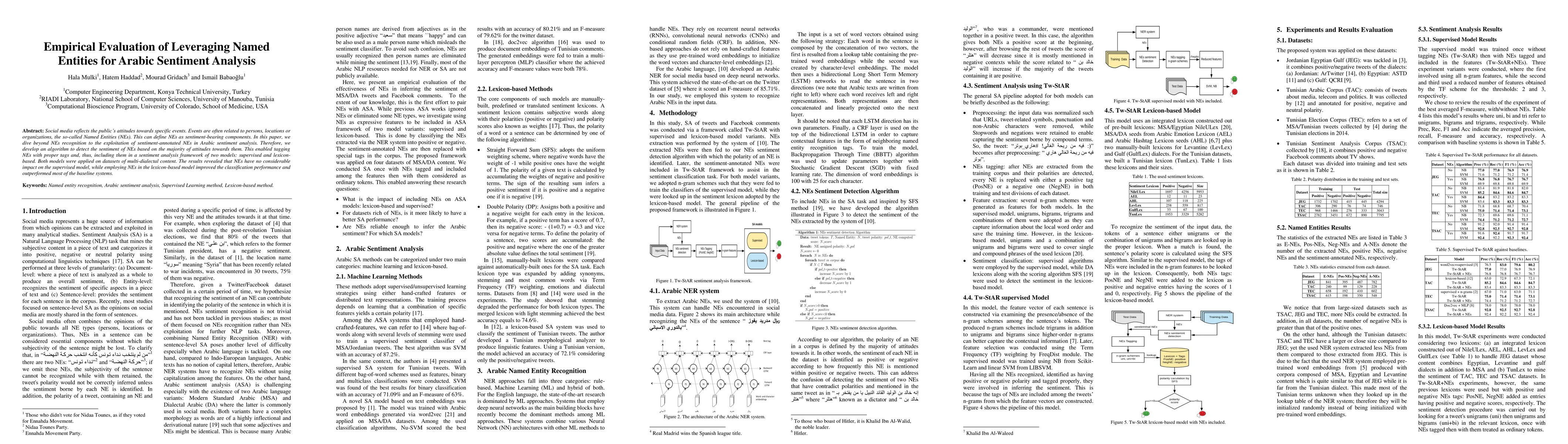 This paper explores the use of sentiment-annotated Named Entities for Arabic sentiment analysis, developing an algorithm to detect sentiment based on majority attitudes. Results show Named Entities significantly improve the lexicon-based model over baselines but have minimal impact on supervised models.