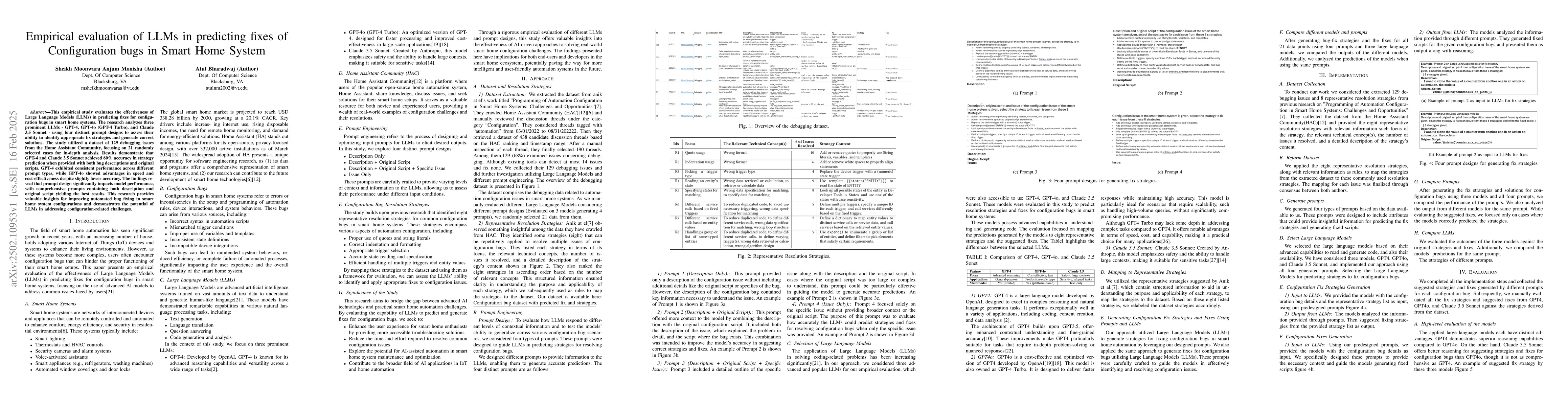 This work is novel in its empirical evaluation of LLMs specifically for predicting fixes of configuration bugs in smart home systems, highlighting the importance of prompt design in model performance.