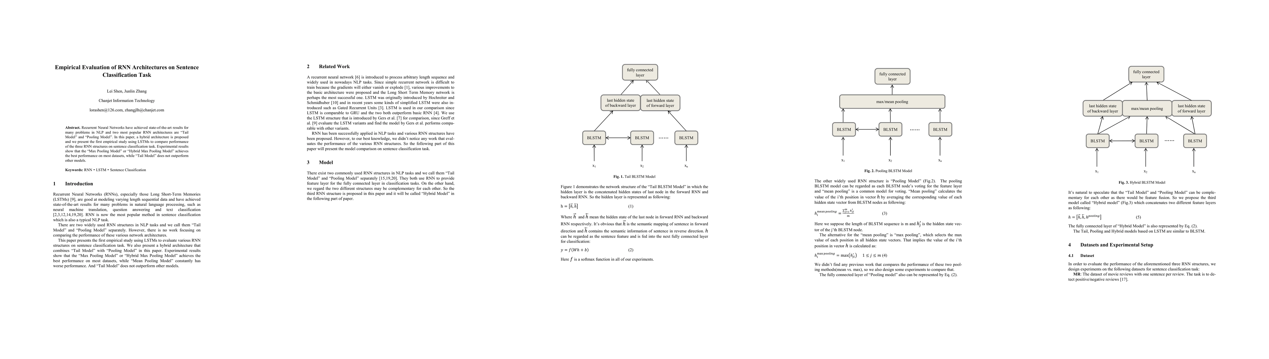 This paper evaluates three RNN architectures—Tail Model, Pooling Model, and a hybrid—on sentence classification tasks using LSTMs. Results indicate that the Max Pooling Model and Hybrid Max Pooling Model outperform the Tail Model, achieving better performance on most datasets.