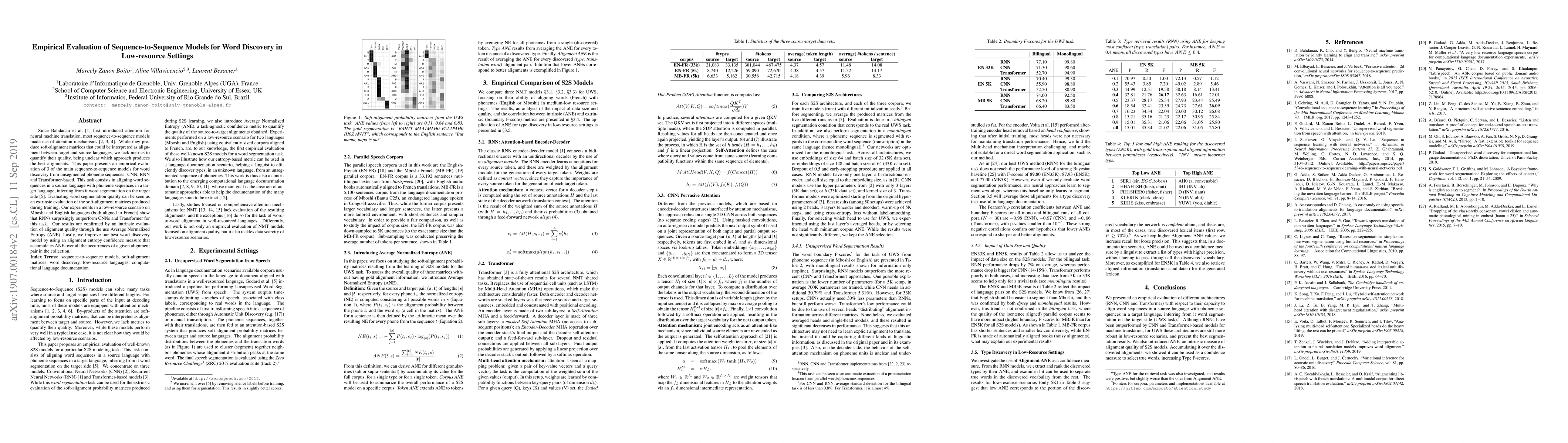 This paper evaluates CNN, RNN, and Transformer models for word discovery in low-resource settings, finding that RNNs outperform others in aligning word sequences with phoneme sequences. An intrinsic evaluation using Average Normalized Entropy confirms RNNs' effectiveness, and an improved model leverages alignment entropy confidence measures.