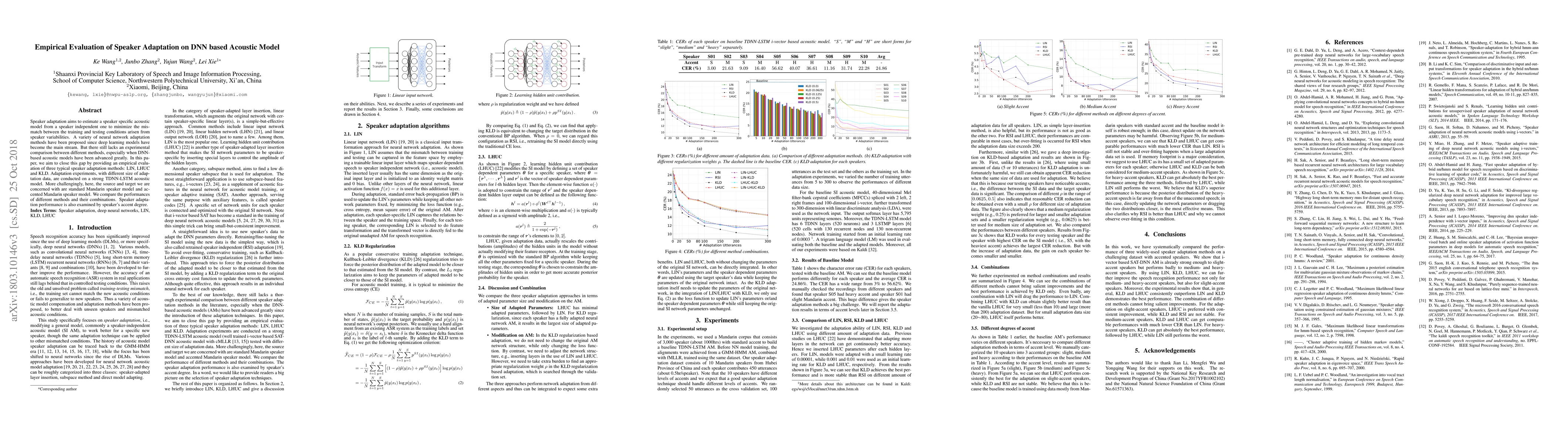 This paper evaluates three speaker adaptation methods—LIN, LHUC, and KLD—on a DNN-based acoustic model to minimize speaker variability mismatch. The study compares their performance on Mandarin speaker models, including standard and accented varieties, to determine the most effective adaptation technique.