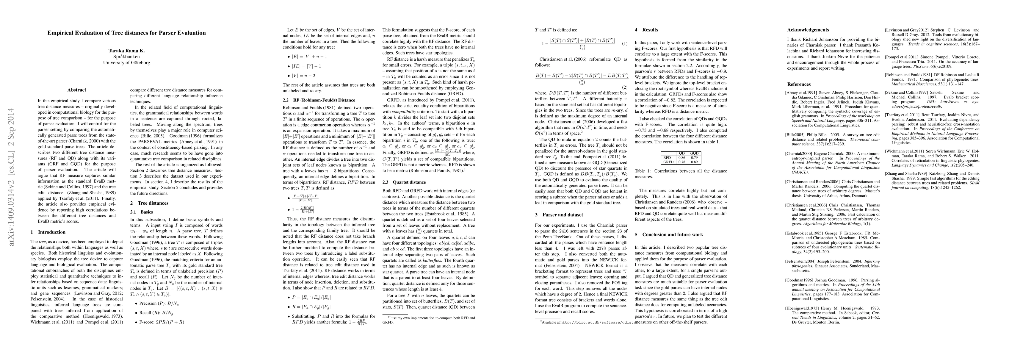 In this empirical study, I compare various tree distance measures -- originally developed in computational biology for the purpose of tree comparison -- for the purpose of parser evaluation. I will control for the parser setting by comparing the automatically generated parse trees from the state-of-the-art parser Charniak, 2000) with the gold-standard parse trees. The article describes two different tree distance measures (RF and QD) along with its variants (GRF and GQD) for the purpose of parser evaluation. The article will argue that RF measure captures similar information as the standard EvalB metric (Sekine and Collins, 1997) and the tree edit distance (Zhang and Shasha, 1989) applied by Tsarfaty et al. (2011). Finally, the article also provides empirical evidence by reporting high correlations between the different tree distances and EvalB metric's scores.