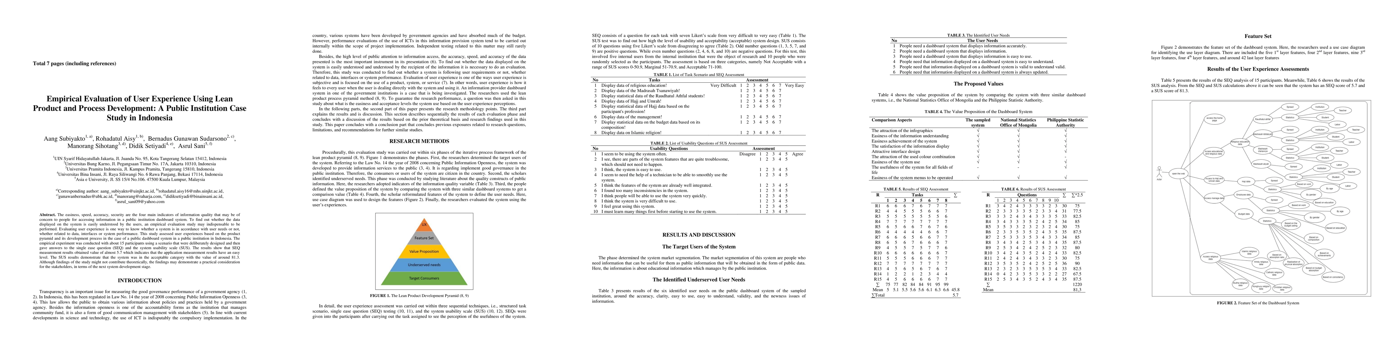 The easiness, speed, accuracy, security are the four main indicators of information quality that may be of concern to people for accessing information in a public institution dashboard system. To find out whether the data displayed on the system is easily understood by the users, an empirical evaluation study may indispensable to be performed. Evaluating user experience is one way to know whether a system is in accordance with user needs or not, whether related to data, interfaces or system performance. This study assessed user experiences based on the product pyramid and its development process in the case of a public dashboard system in a public institution in Indonesia. The empirical experiment was conducted with about 15 participants using a scenario that were deliberately designed and then gave answers to the single ease question (SEQ) and the system usability scale (SUS). The results show that SEQ measurement results obtained value of almost 5.7 which indicates that the application measurement results have an easy level. The SUS results demonstrate that the system was in the acceptable category with the value of around 81.3. Although findings of the study might not contribute theoretically, the findings may demonstrate a practical consideration for the stakeholders, in terms of the next system development stage.