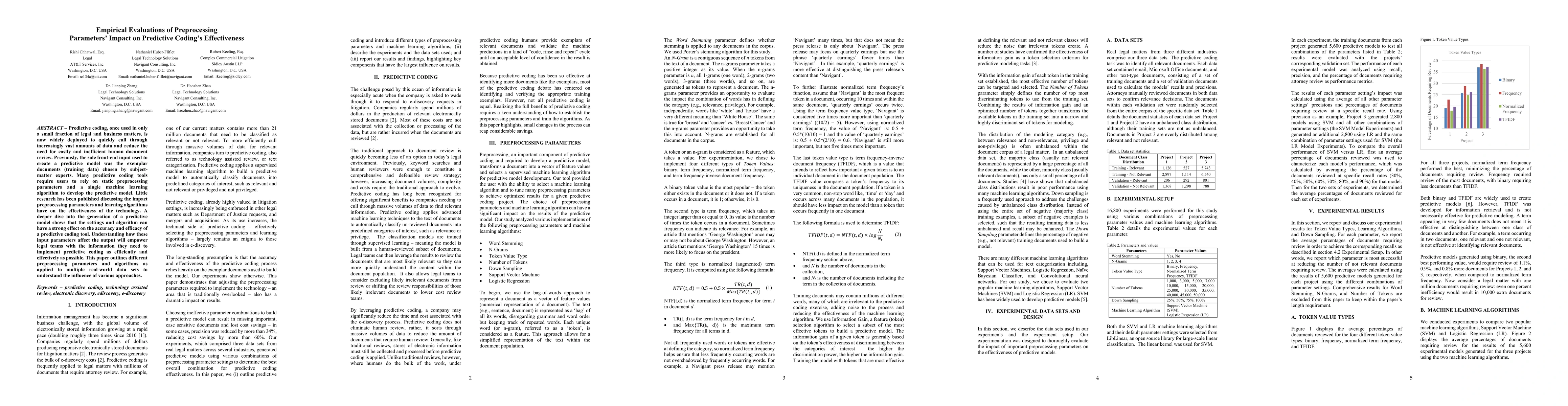 This paper evaluates the impact of different preprocessing parameters and machine learning algorithms on the effectiveness of predictive coding tools, demonstrating how these inputs significantly influence model accuracy and efficiency. The findings provide valuable insights for legal teams to optimize predictive coding implementations.
