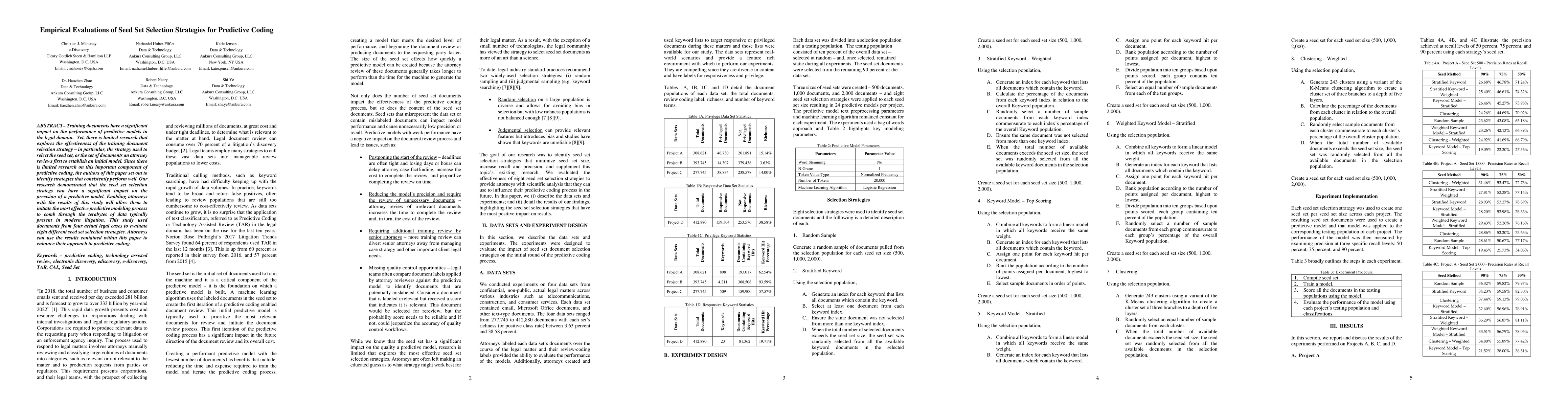 This paper evaluates eight different seed set selection strategies for predictive coding in the legal domain, demonstrating their impact on model precision. The findings provide attorneys with insights to optimize their initial document review process, thereby enhancing the effectiveness of predictive modeling in legal cases.