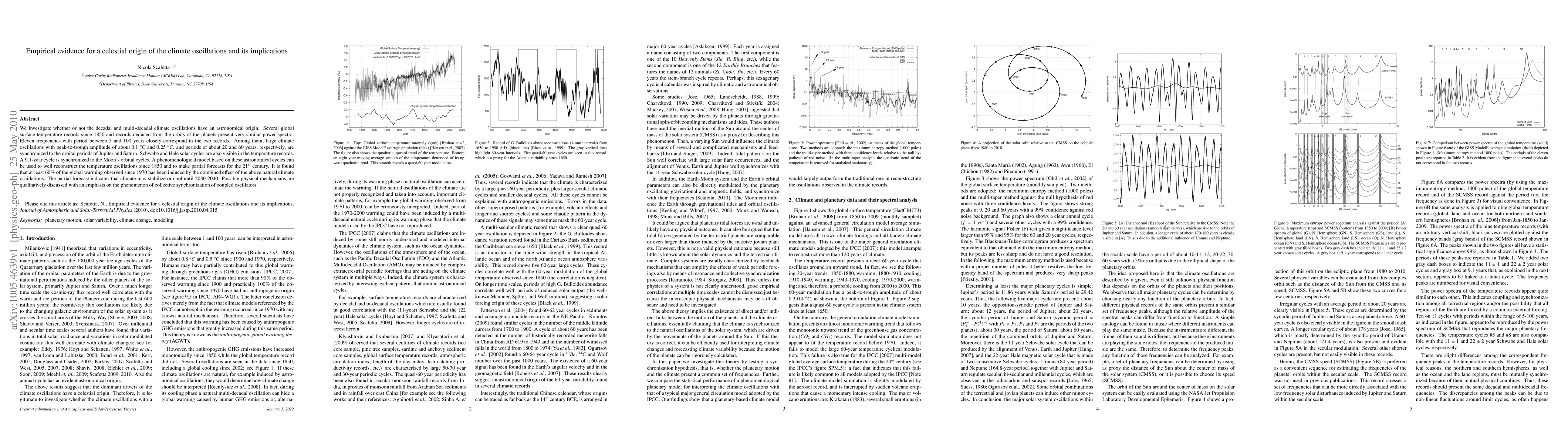This paper finds that decadal and multi-decadal climate oscillations have significant astronomical origins, correlating global temperature records with planetary and lunar orbital cycles. The study suggests that natural oscillations account for 60% of the global warming since 1970 and predicts a potential stabilization or cooling trend in the near future.