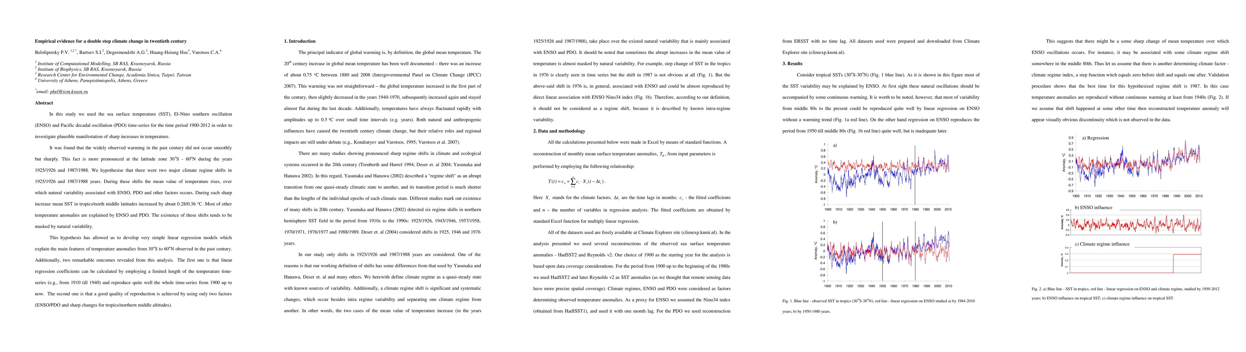 In this study we used the sea surface temperature (SST), El-Nino southern oscillation (ENSO) and Pacific decadal oscillation (PDO) time-series for the time period 1900-2012 in order to investigate plausible manifestation of sharp increases in temperature. It was found that the widely observed warming in the past century did not occur smoothly but sharply. This fact is more pronounced at the latitude zone 30S - 60N during the years 1925/1926 and 1987/1988. We hypothesise that there were two major climate regime shifts in 1925/1926 and 1987/1988 years. During these shifts the mean value of temperature rises, over which natural variability associated with ENSO, PDO and other factors occurs. During each sharp increase mean SST in tropics/north middle latitudes increased by about 0.28/0.36 {\deg}C. Most of other temperature anomalies are explained by ENSO and PDO. The existence of these shifts tends to be masked by natural variability. This hypothesis has allowed us to develop very simple linear regression models which explain the main features of temperature anomalies from 30oS to 60oN observed in the past century. Additionally, two remarkable outcomes revealed from this analysis. The first one is that linear regression coefficients can be calculated by employing a limited length of the temperature time-series (e.g., from 1910 till 1940) and reproduce quite well the whole time-series from 1900 up to now. The second one is that a good quality of reproduction is achieved by using only two factors (ENSO/PDO and sharp changes for tropics/northern middle altitudes).