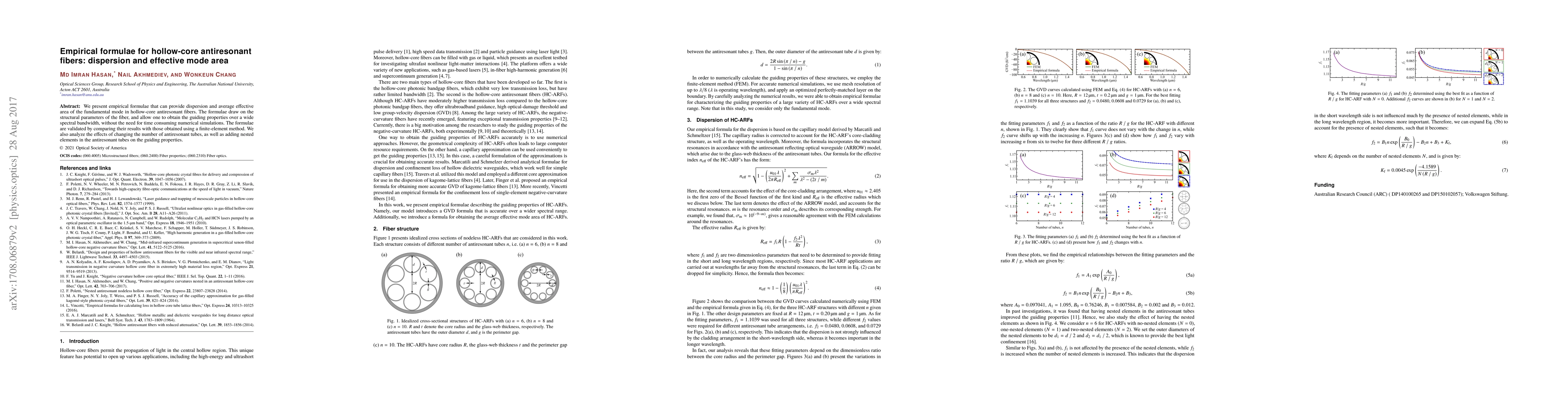 This paper introduces empirical formulae for estimating dispersion and effective mode area in hollow-core antiresonant fibers, based on structural parameters, validated against finite-element method results. The study also examines how varying the number of antiresonant tubes and adding nested elements affects these properties.